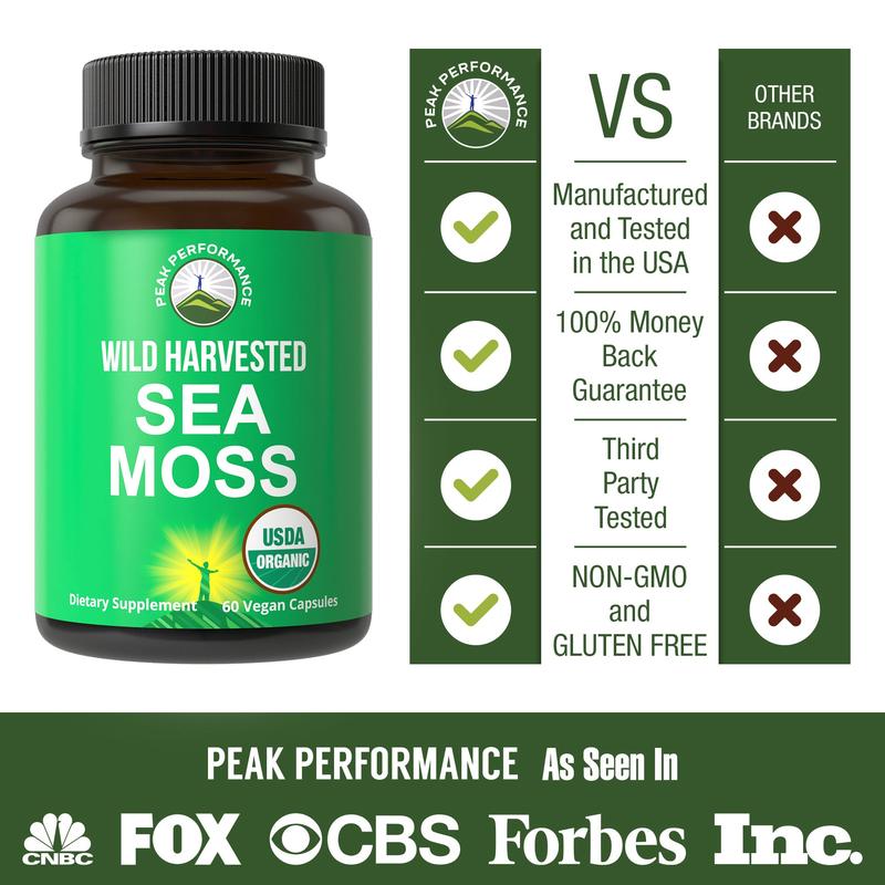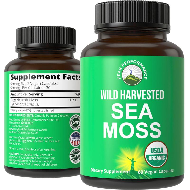 ·Not all Sea Moss capsules are created equal! Many Sea Moss supplements on the market contain fillers including cheap bladderwrack and burdock root with less than 300mg of actual sea moss. Peak Performance Wild Harvested Sea Moss ensures you get 1200mg of pure, vegan, wild harvested sea moss per serving.