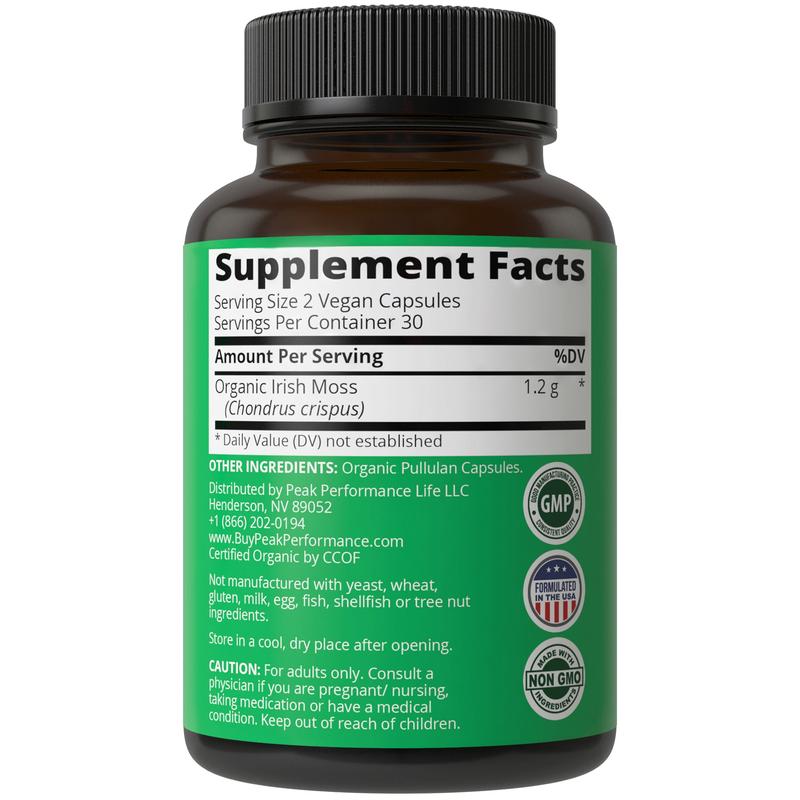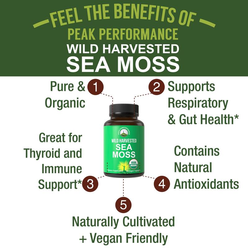 ·Why Peak Performance Wild Harvested Sea Moss? Irish Sea Moss (Chondrus crispus), a species of wild harvested red algae, has been well researched for its herbal benefits. The high potassium chloride content of Irish Moss makes it beneficial for supporting respiratory health.* Also great for gut, thyroid and immune support.*