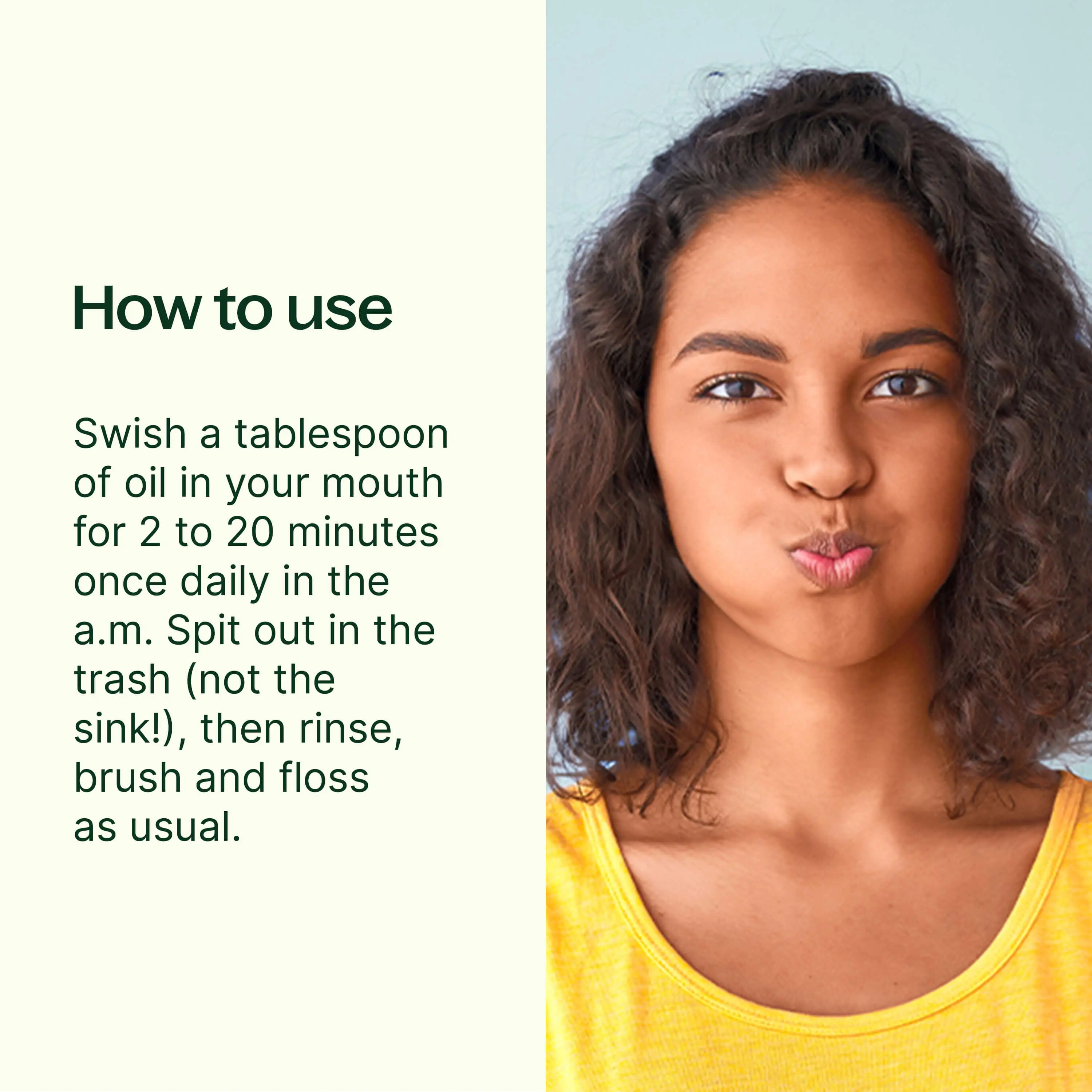 ·Easy to Use: Simply add a tablespoon in your mouth and swish for 2-5 minutes to start, working up to 15-20 minutes. When you're done, spit into the trash, rinse your mouth with water, and brush your teeth. Oil pulling is an excellent boost to your oral health routine but not a replacement for regular visits with your dentist.