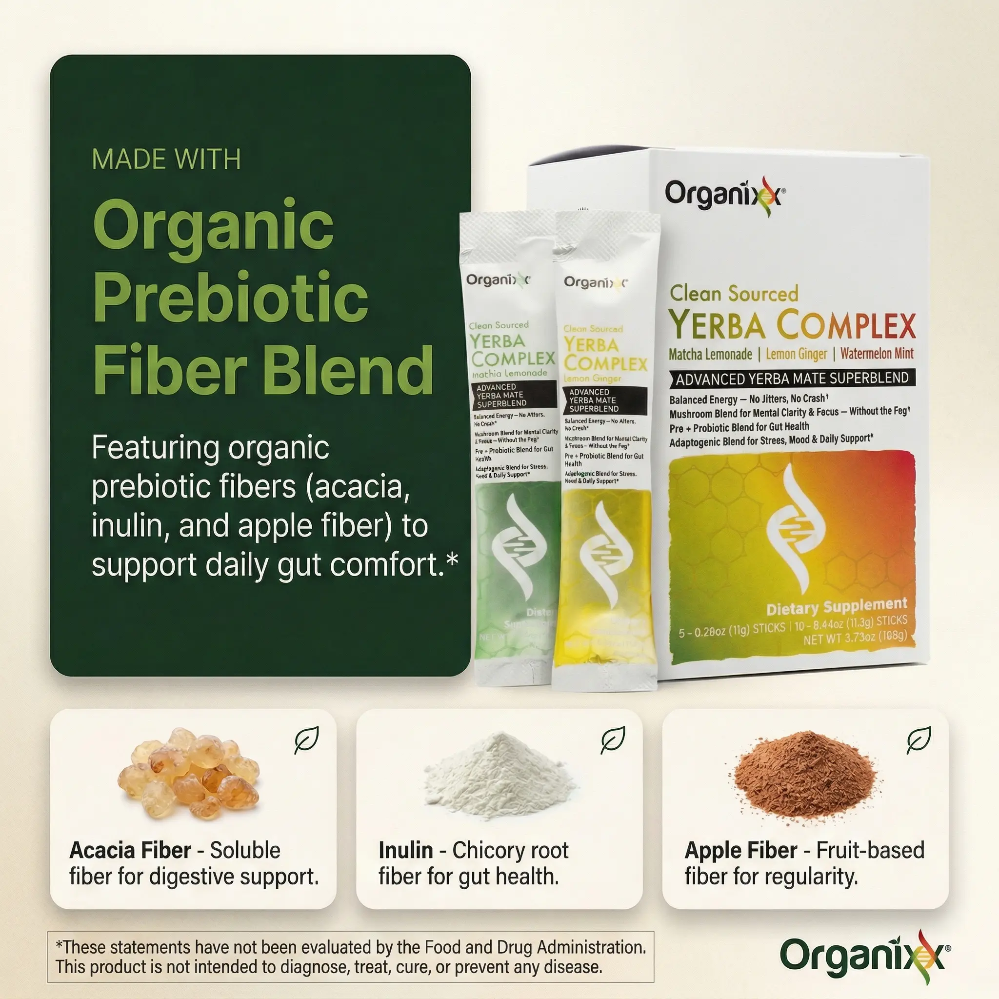 ·Energy, Digestive Comfort & Daily Balance Formulated with yerba mate, prebiotic fiber, probiotics, and botanicals including ashwagandha, lion’s mane, and chaga. Crafted to support mental clarity, digestive comfort, and sustained vitality as part of a balanced lifestyle.