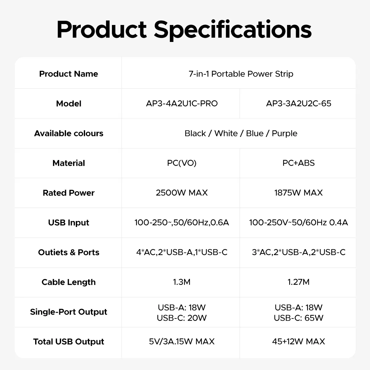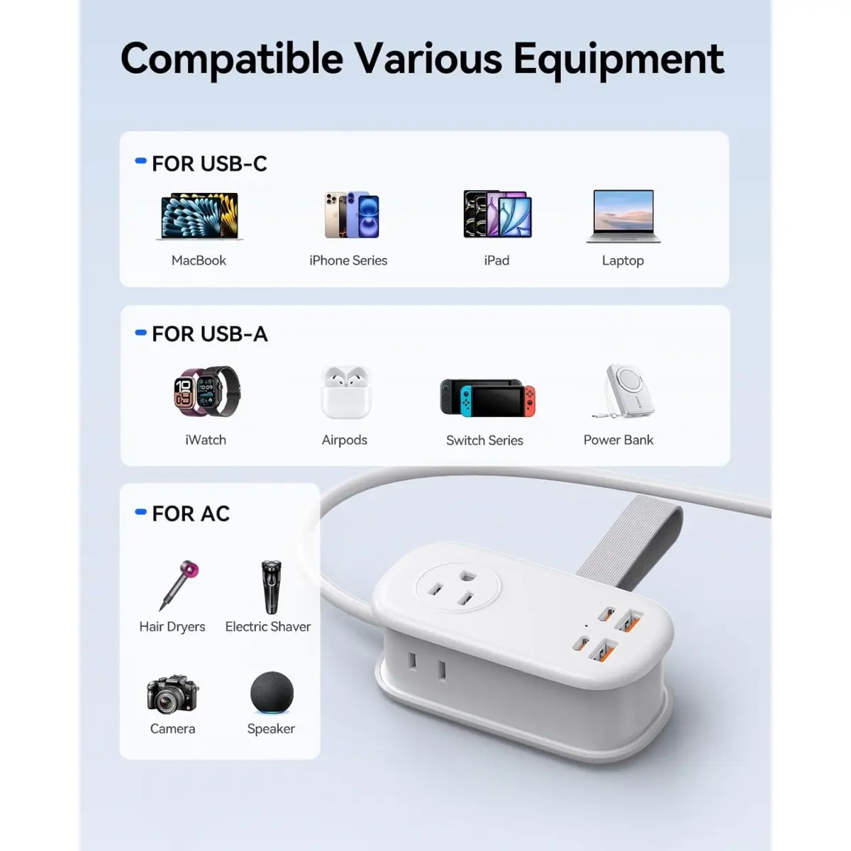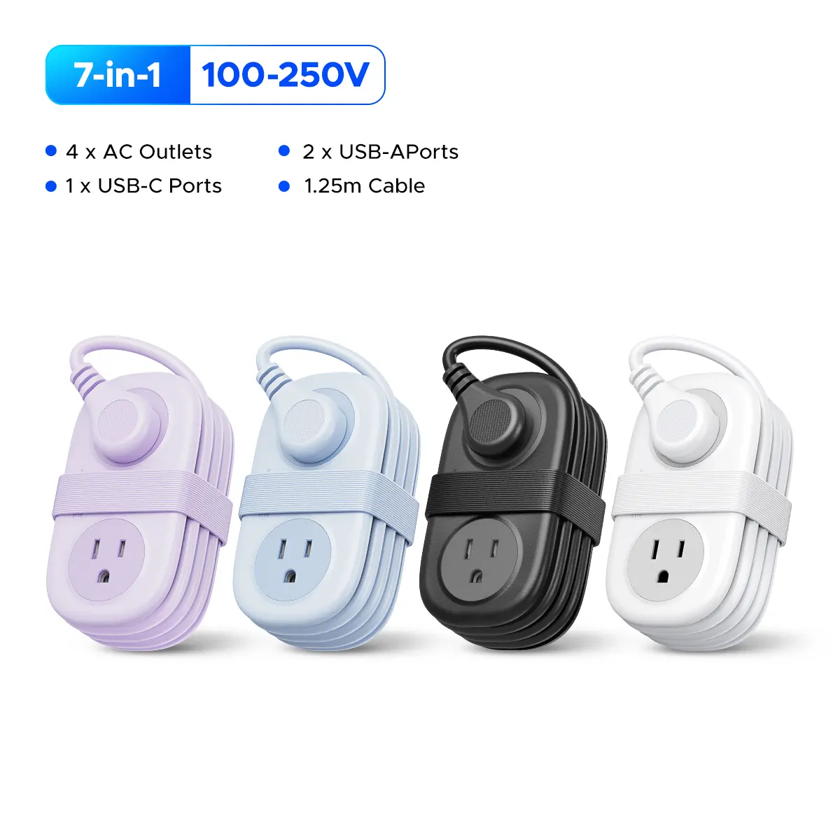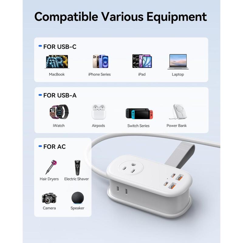 Compact and portable, this power strip features 3 AC outlets, 2 USB-A ports, and 2 USB-C ports. Perfect for charging multiple devices on the go. Its retractable cord design makes it easy to carry and store. Ideal for travelers and office use, ensuring your devices stay powered up anytime, anywhere