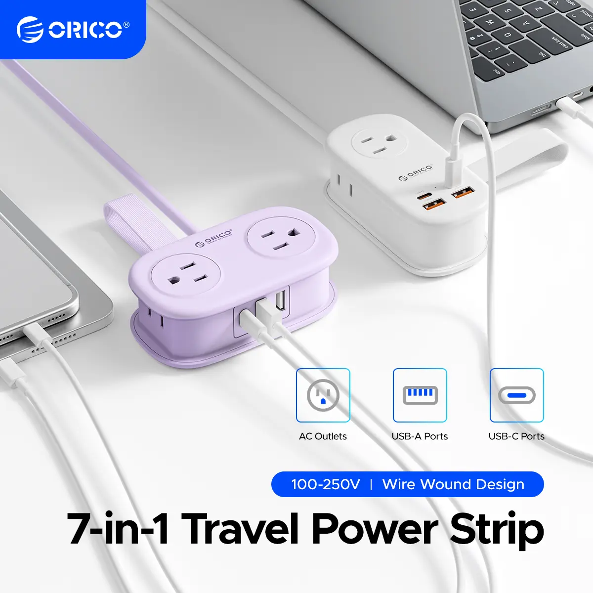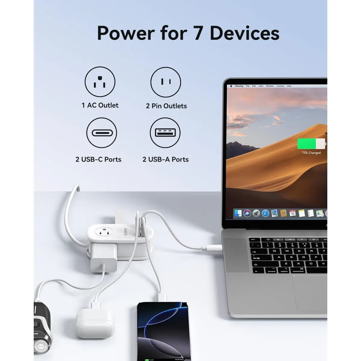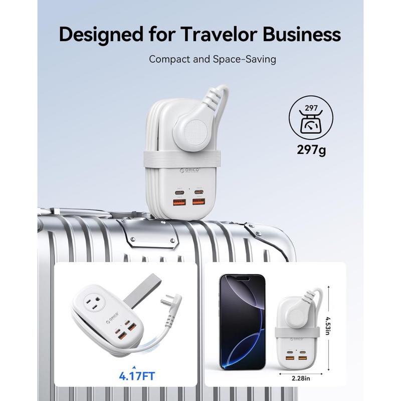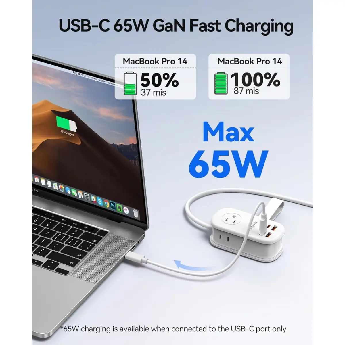 ORICO GaN technology to quickly charge devices. It reaches 50% on a MacBook Pro in 37 minutes and 100% in 87 minutes. It also works with smartphones, tablets, and laptops, providing fast. The Power Strip efficient power for your busy life