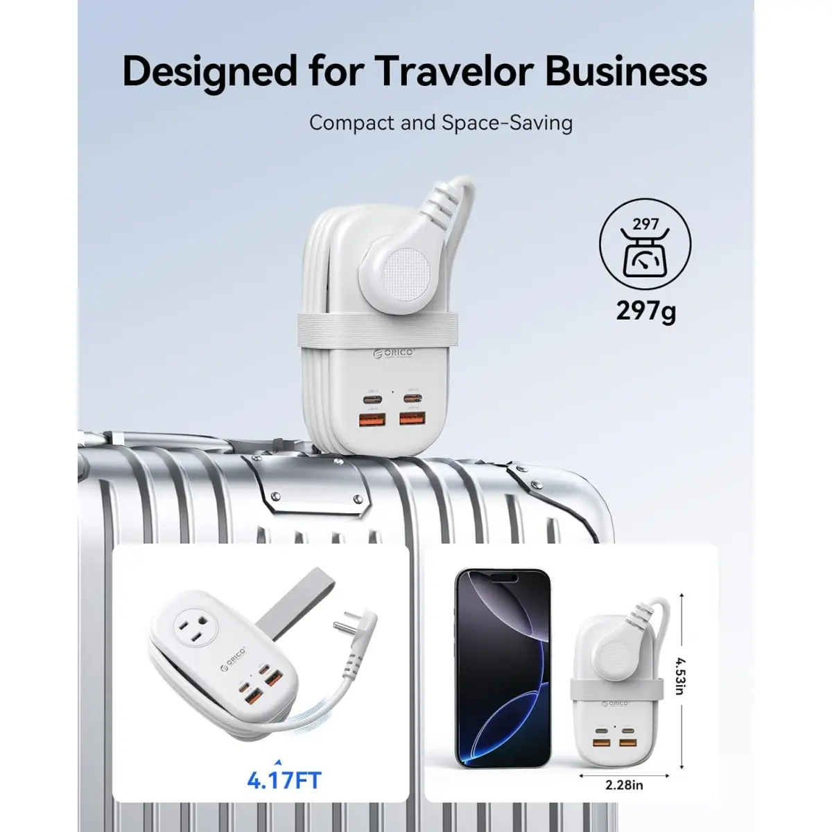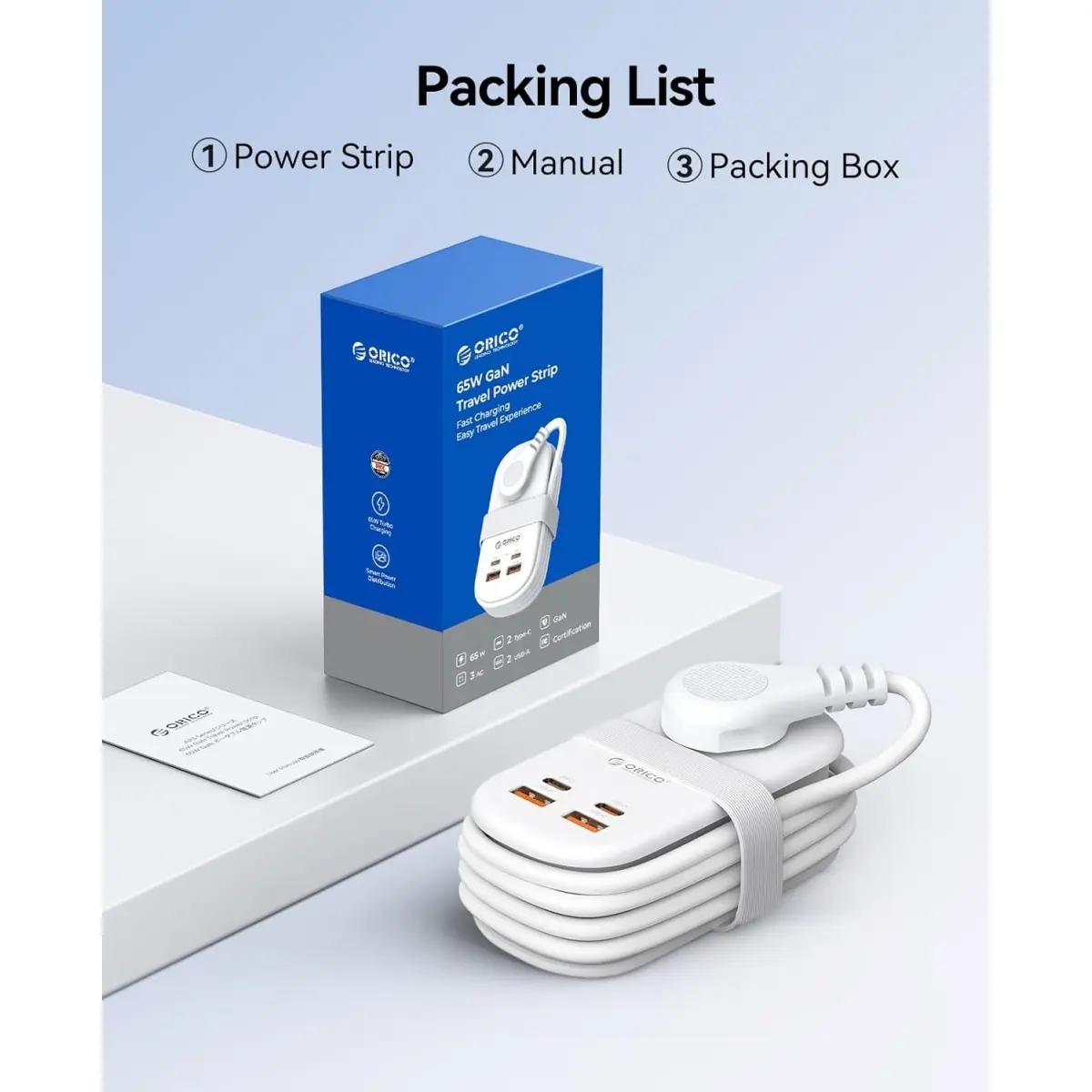 ORICO 65W GaN travel power strip is small and lightweight, with dimensions of just 4.53" x 2.28" x 1.65", and no surge protector. Perfect for slipping into your luggage or backpack, it makes travel charging easy and hassle-free. Designed for frequent travelers, it keeps your charging needs organized on the go