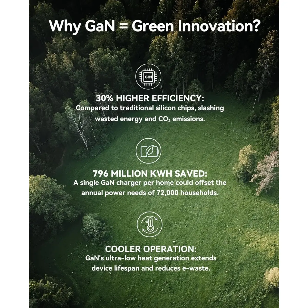 ORICO 65W GaN Travel Power Strip is 30% more efficient than traditional silicon chips, reducing energy waste and COâ emissions. It runs cooler to extend device life and cut e-waste. One GaN charger can save up to 796 million kWh annually, enough for 72,000 homes. Choose GaN for a greener future