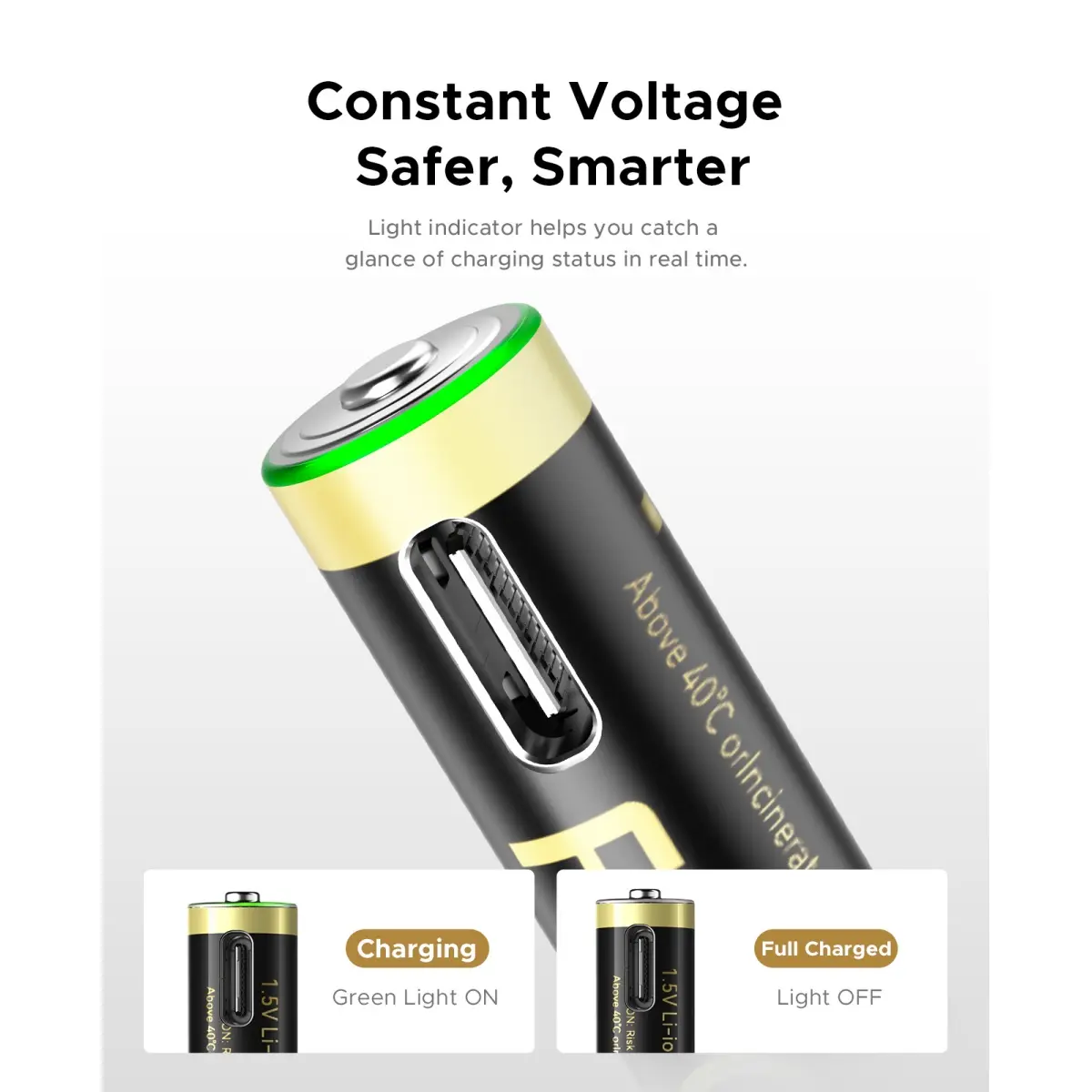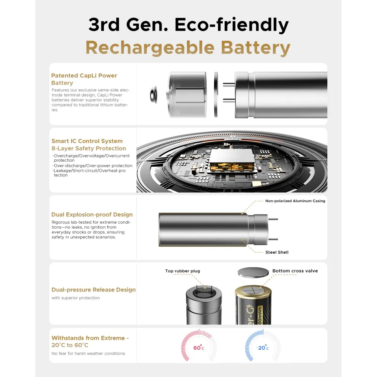 Charging is a breeze with the built-in USB-C port. Just plug in any standard Type-C cable, and you'll have a full charge in just 1 hour—eight times faster than traditional rechargeable batteries. Safety is top priority with an 8-layer protection system guarding against overcharging, overheating, leaks, and more, all wrapped in a durable dual explosion-proof shell.