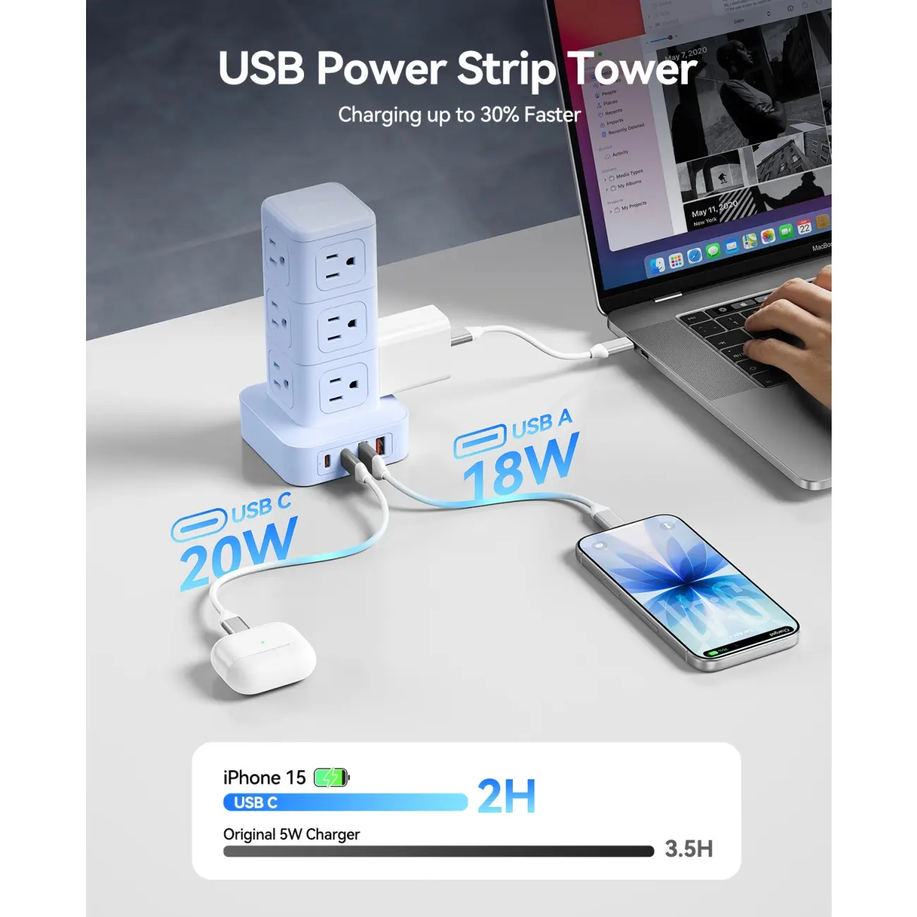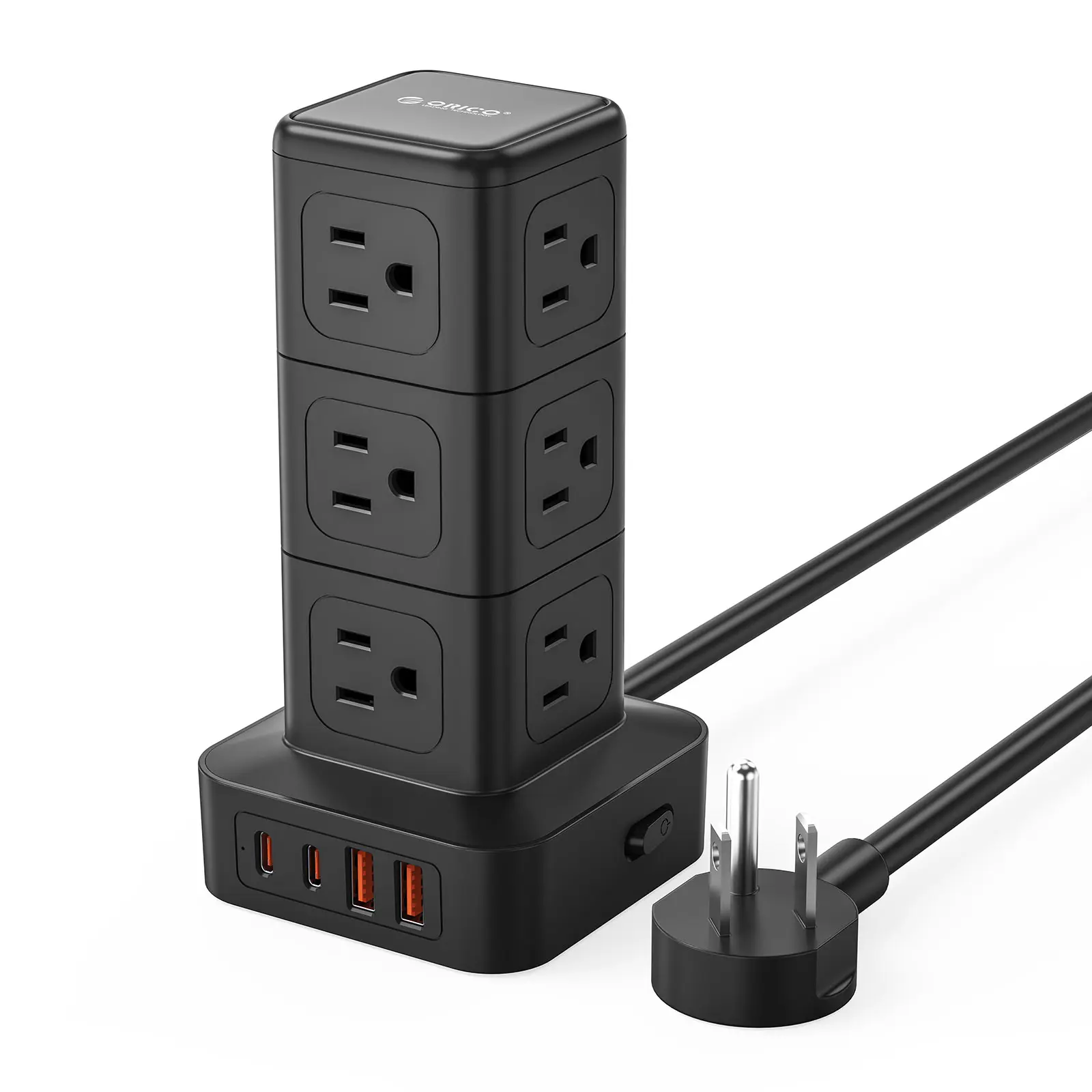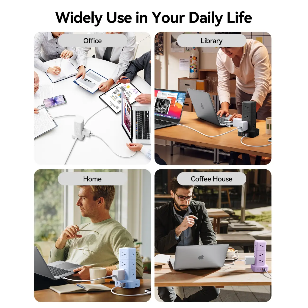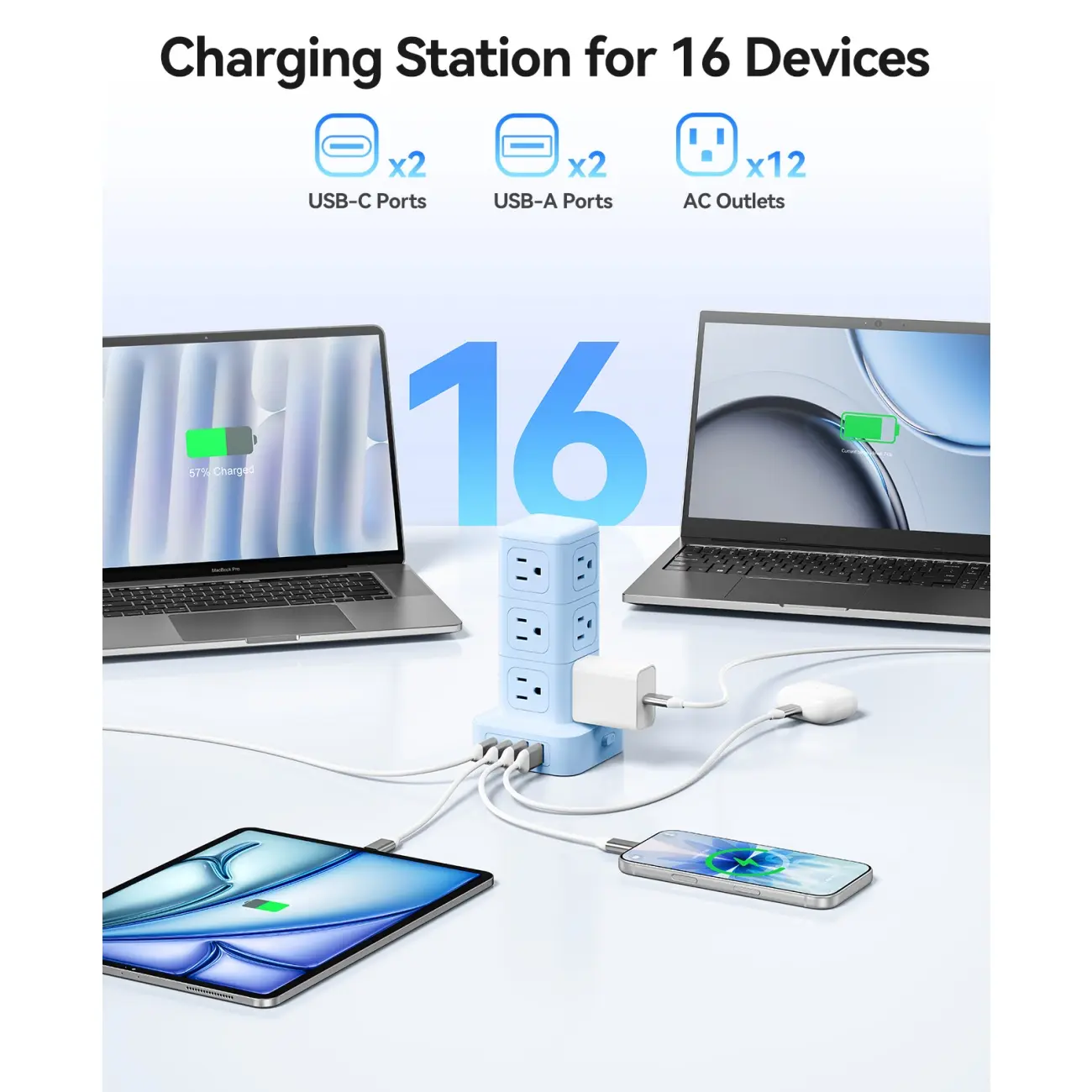 16 in 1 USB Power Strip Tower: Expands one outlet into multiple โ 12 AC outlets and 4 smart USB ports (2 USB-A and 2 USB-C). Charge up to 16 devices simultaneously for a neat desktop, Turns a single socket into a versatile multi-port charging station, perfect for home, office, or dorm.
