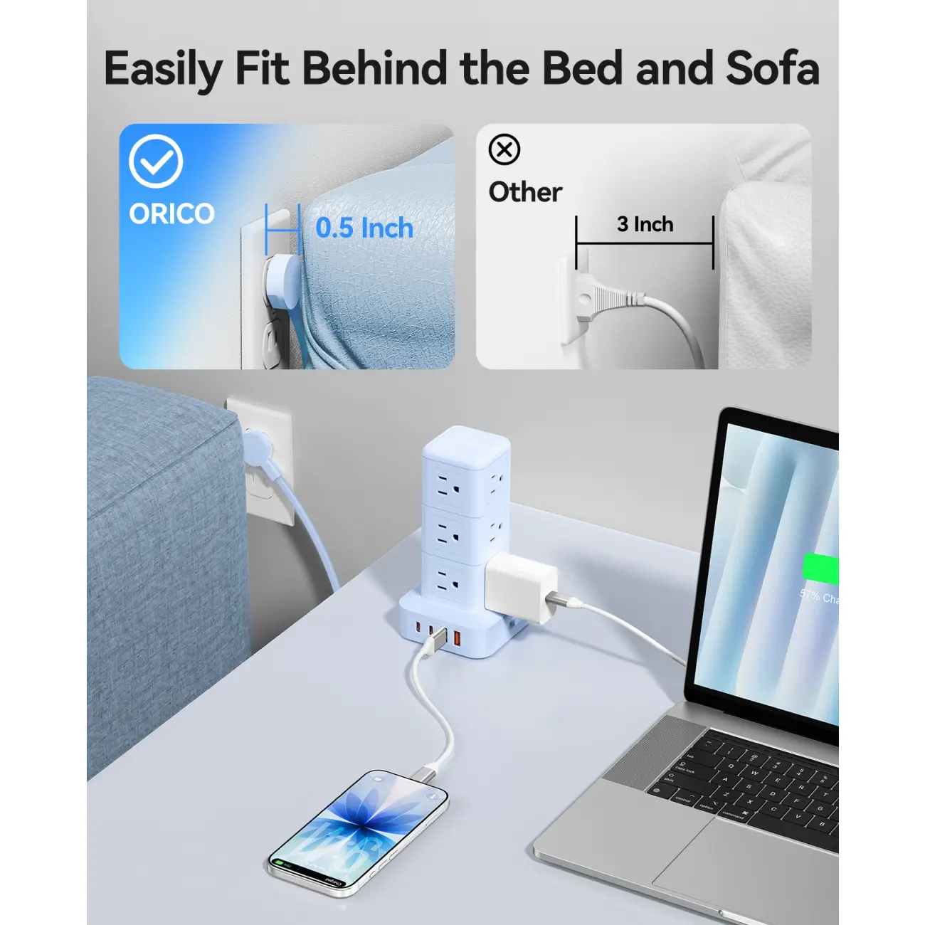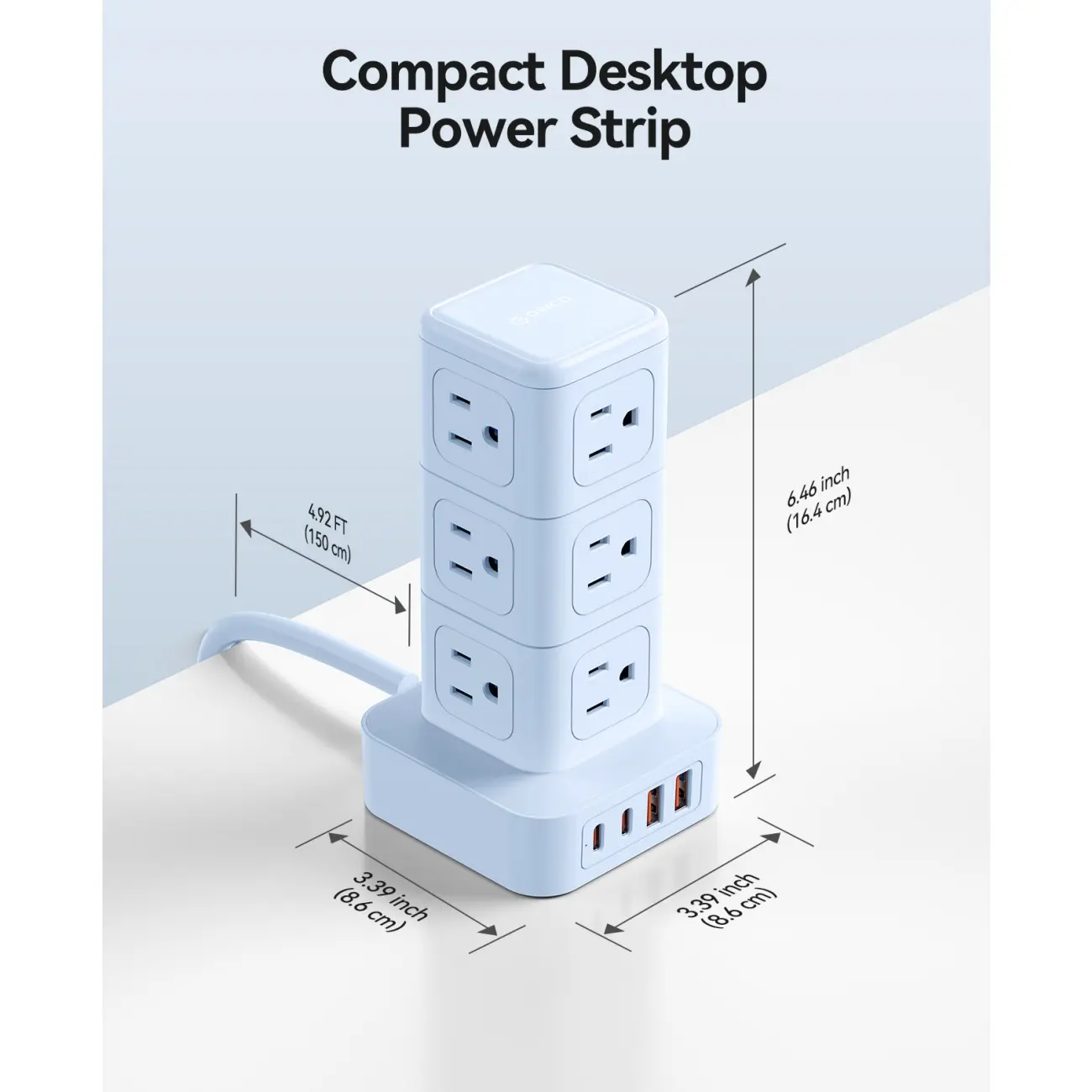 Space-Saving Vertical Tower Design: 4-side compact design tower power strip (3.39*3.39*6.46 Inch) takes up less space than traditional power strips while charging multiple devices, organizes messy cables, and keeps your desk tidy. Four rubber feet on the bottom prevent 5ft extension cord from slipping and sliding.