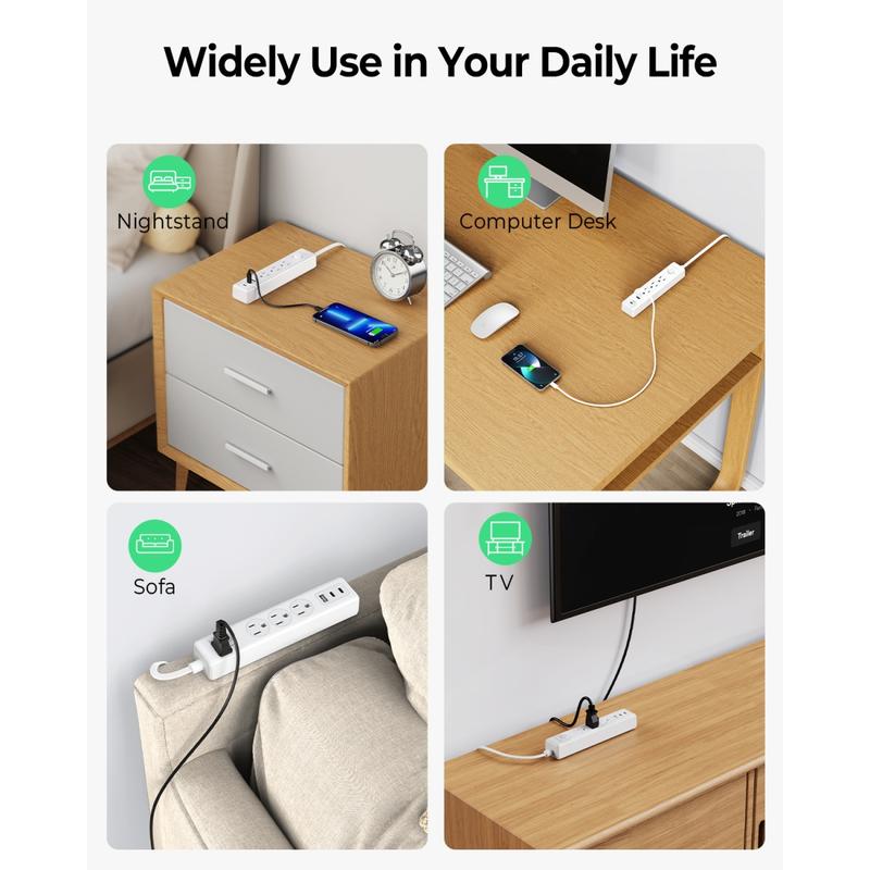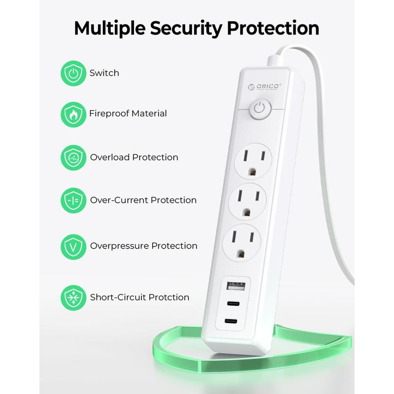 5. ORICO PW-3A1U2C 25FT Flat Extension Cord, 6-in-1 Power Strip with 3 AC Outlets, 1 USB-A & 2 USB-C Ports, Multiple Protection, Compact for Home & Office-PW