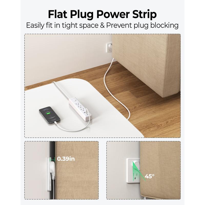 ORICO PW-3A1U2C 25FT Flat Extension Cord, 6-in-1 Power Strip with 3 AC Outlets, 1 USB-A & 2 USB-C Ports, Multiple Protection, Compact for Home & Office-PW