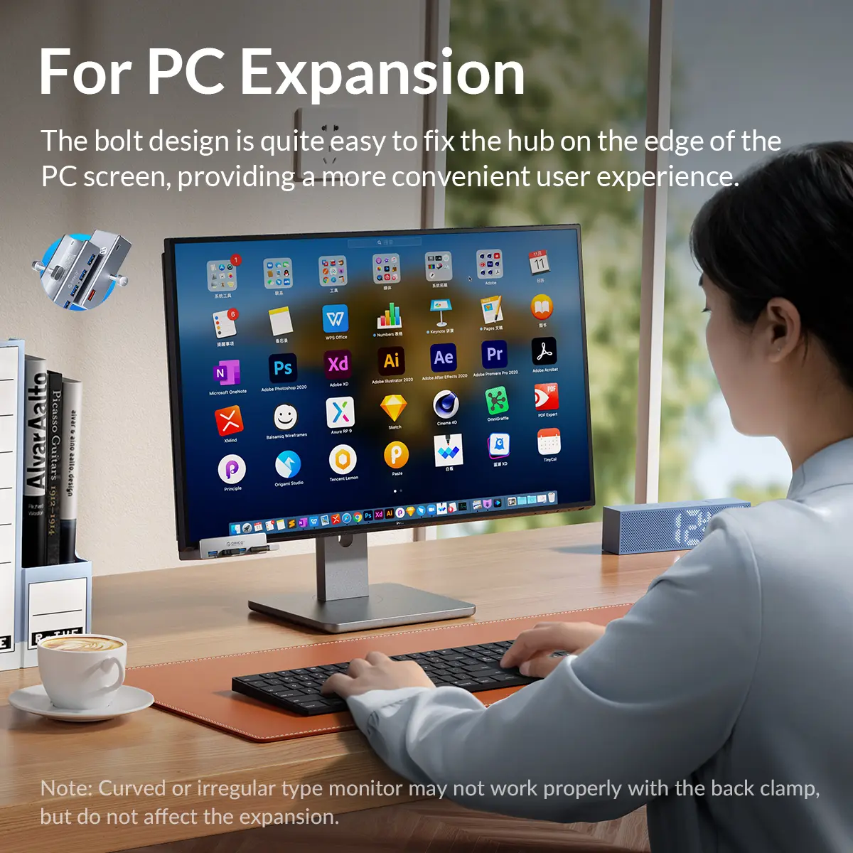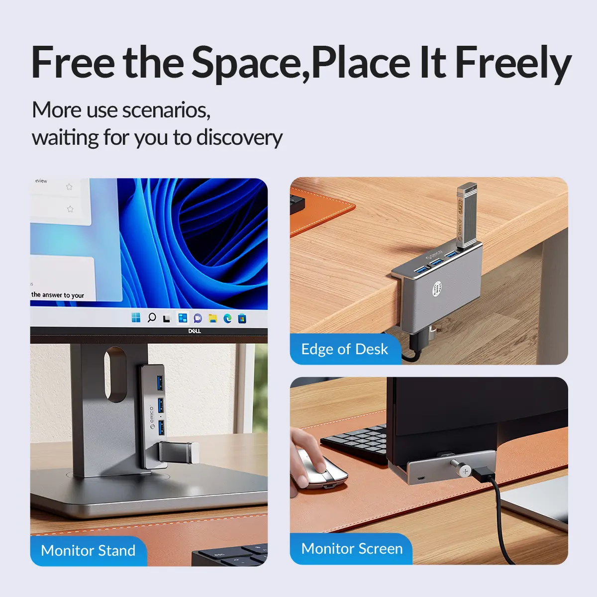 ORICO mountable usb hub designed with adjustable screw allow you to mount monitor screen edge or desk edge thickness from 0.39 to 1.26 inches (10-32mm), It can be firmly fixed on the edge of the desktop or monitor for a semi-permanent mount, and will not shake or move when plugged in or out.The parts in contact with the desktop or monitor are covered with soft silicone pads to avoid scratches.