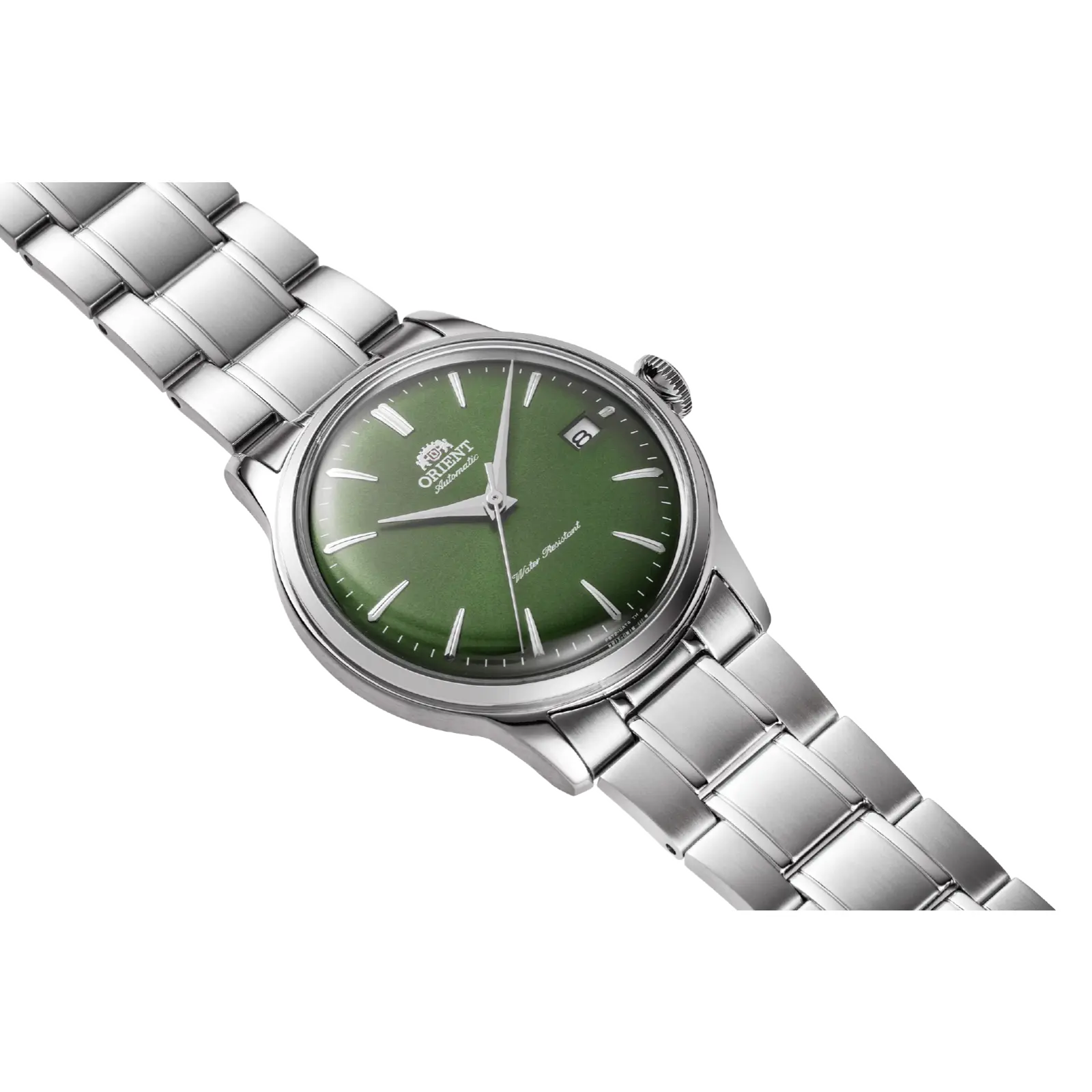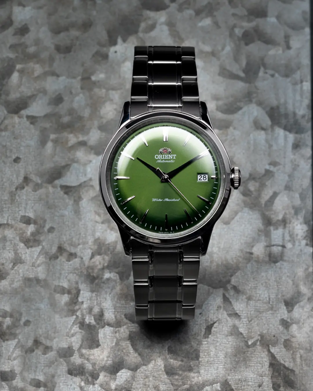 The Orient Bambino Version 7 features a 38.4mm stainless steel case with a domed mineral crystal. It boasts a green dial and a hand-wound automatic movement, F6724 Caliber. The watch offers a hacking function with a 40-hour power reserve. A date display and exhibition caseback add practicality. Water-resistant up to 30m, it's perfect for everyday wear.