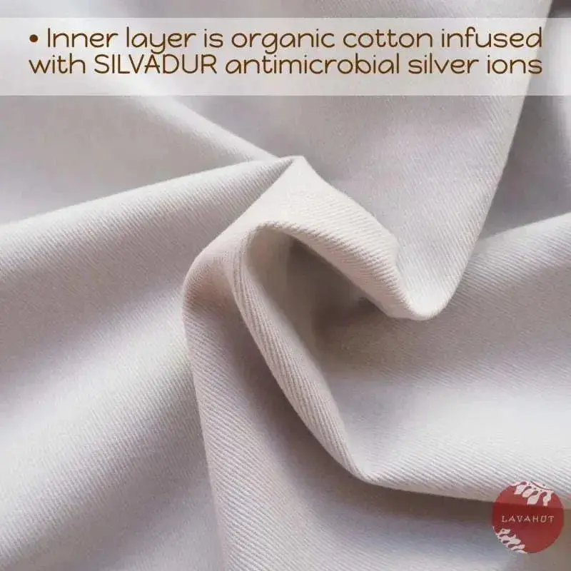 ·Innermost layer: 100% organic cotton infused with SILVADUR™ antimicrobial silver ions to inhibit bacterial growth without toxic chemicals