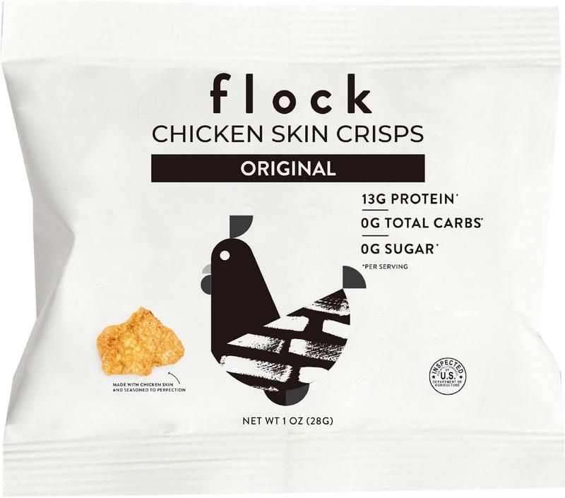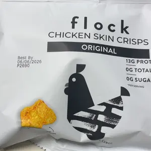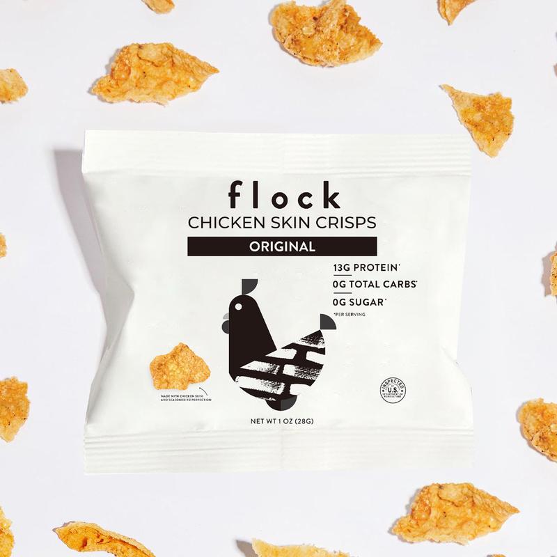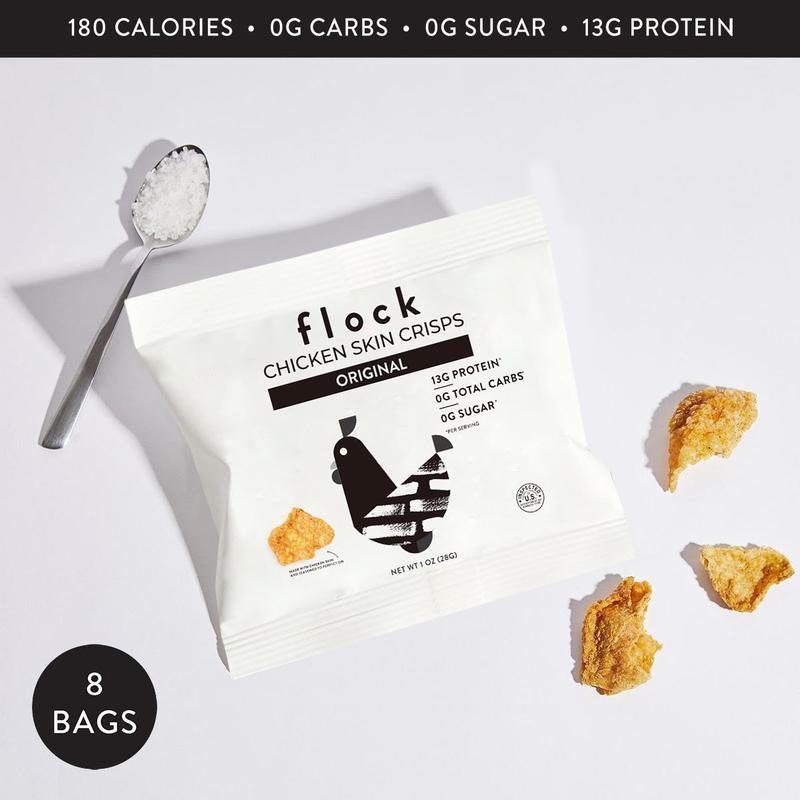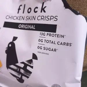 Flock Chicken Skin Crisps are made from real chicken skins, seasoned with simple sea salt, and fried to crispy perfection. Each bag contains 13 g of protein, with 0 g carbs and 0 g sugar. The Original Salt flavor offers pure, golden-fried chicken crunch without junk. Perfect for keto, low-carb, and high-protein diets.