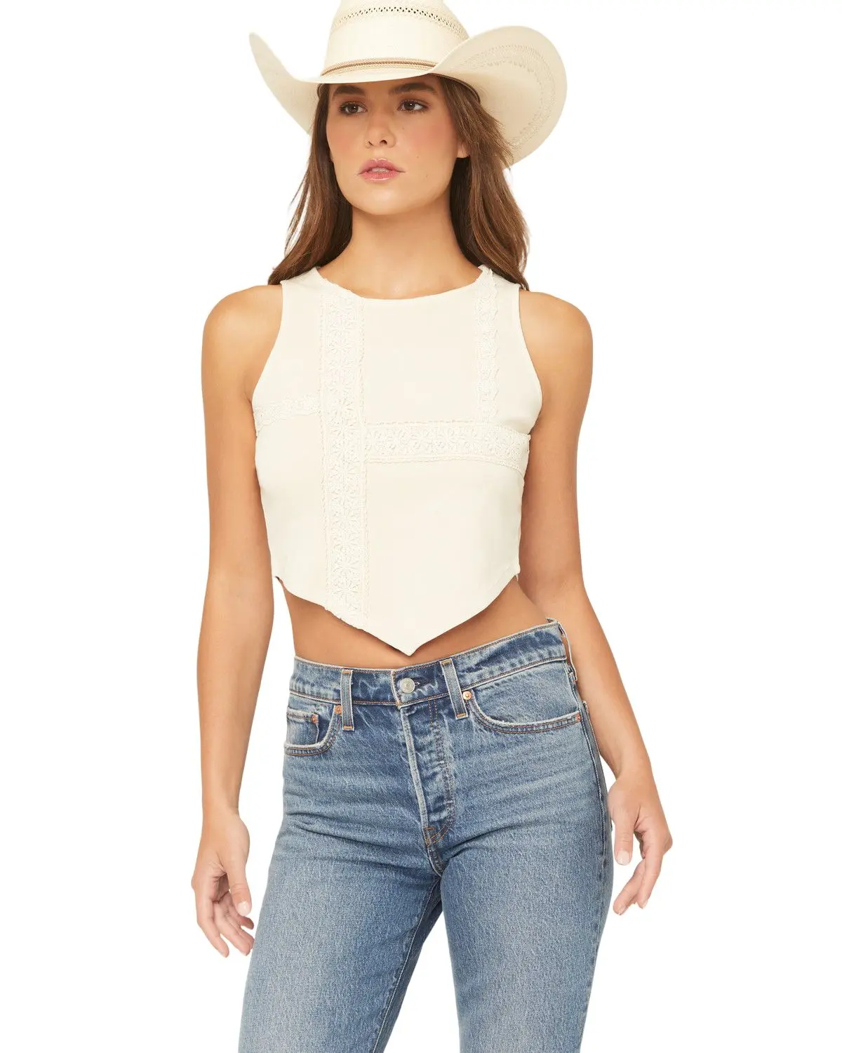 Model is 5'9" wearing a size small. Sleeveless. Handkerchief hem. Scoop neckline. Solid cream design. Floral lace inset panel details throughout. Imported.