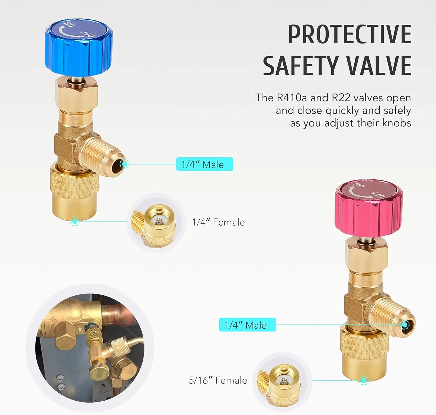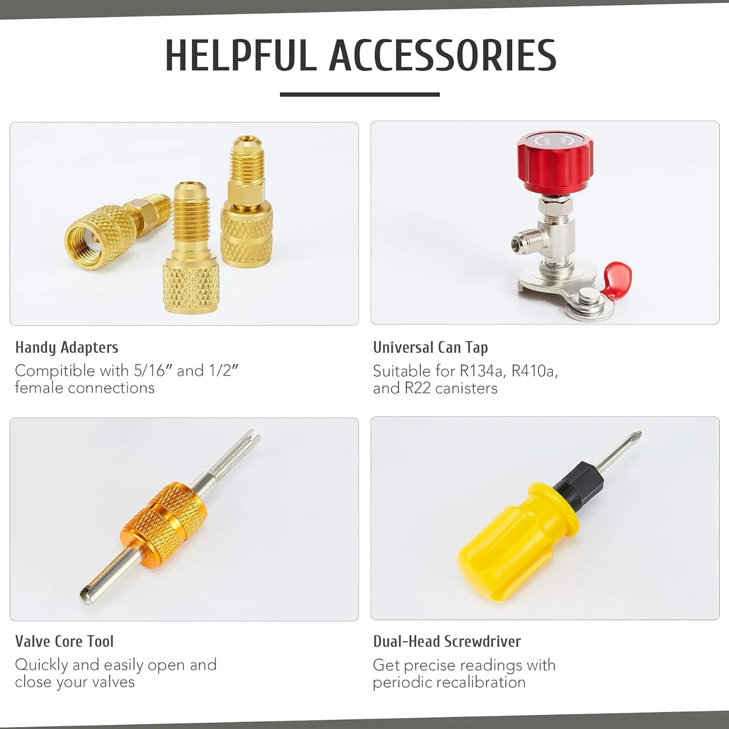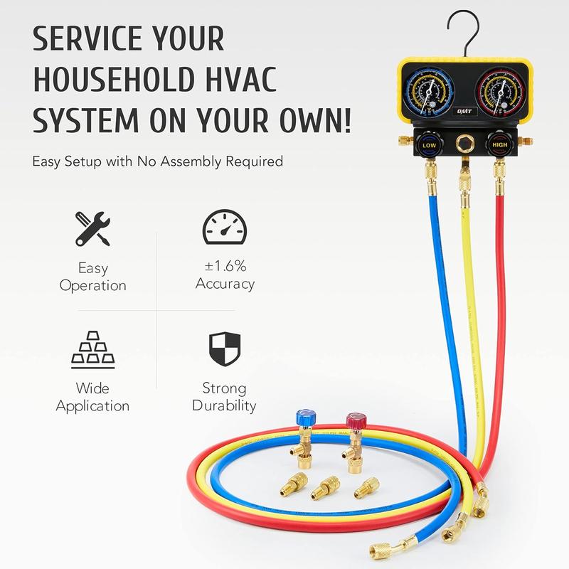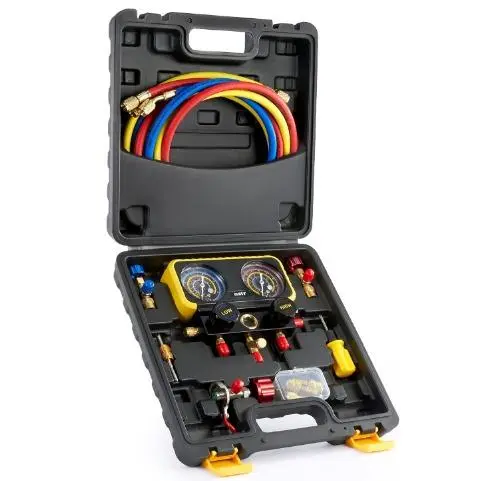This car AC gauge set works with R410a, R22, and R134a refrigerants; ideal for both DIY and professional HVAC maintenance, it allows you to measure your system's pressure, evacuate and refill coolant, and more.