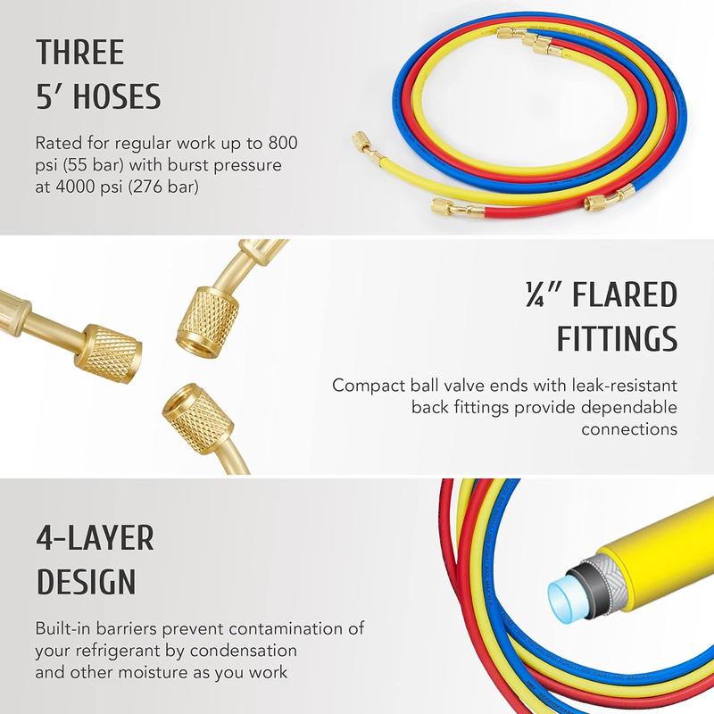 Blue for low, red for high, and yellow for charging, these durable PVC hoses have 4 reinforced layers to work with daily pressure up to 600 psi (burst pressure: 3000 psi).