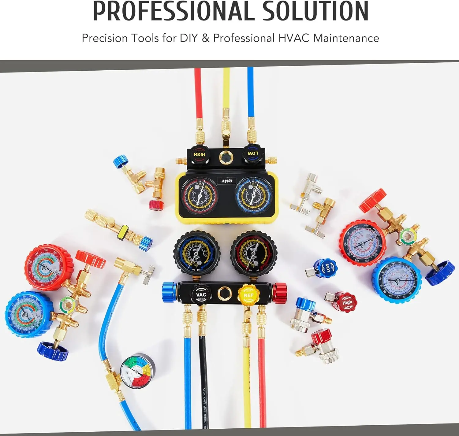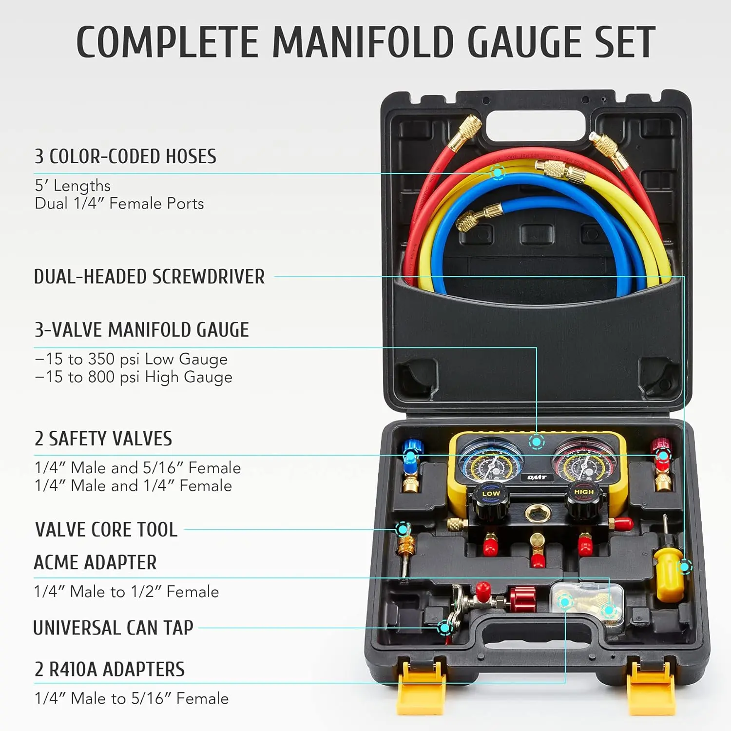 This professional r410a gauges tool kit from Orion Motor Tech includes a 3-way gauge, 3 color-coded hoses, 2 1/4'' to 5/16'' R410a adapters, a 1/4'' to 1/2'' adapter, 2 safety valves, a valve core tool, and a universal can tap; enjoy hassle-free setup and easy operation as you nip your HVAC problems in the bud.