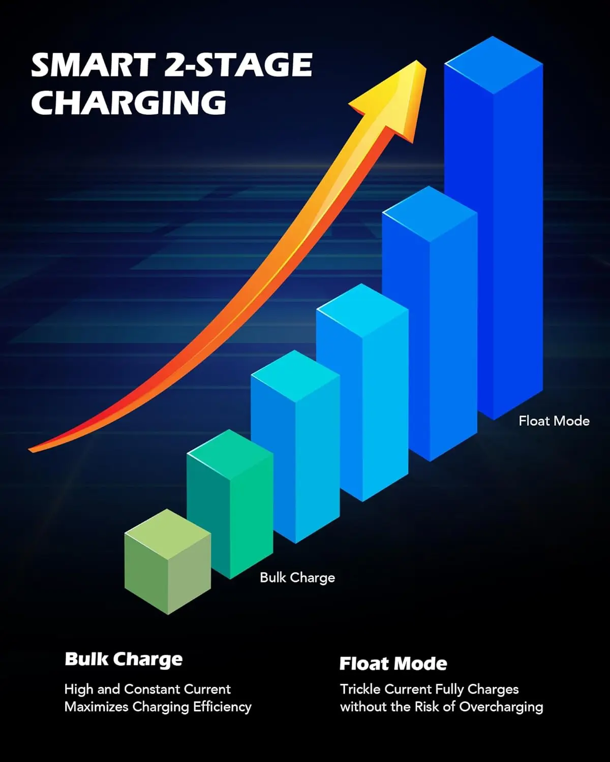 This charger offers Bulk Charge for fast efficiency, Absorption Mode for complete activation without overheating, and Float Mode for maintaining a full charge safely