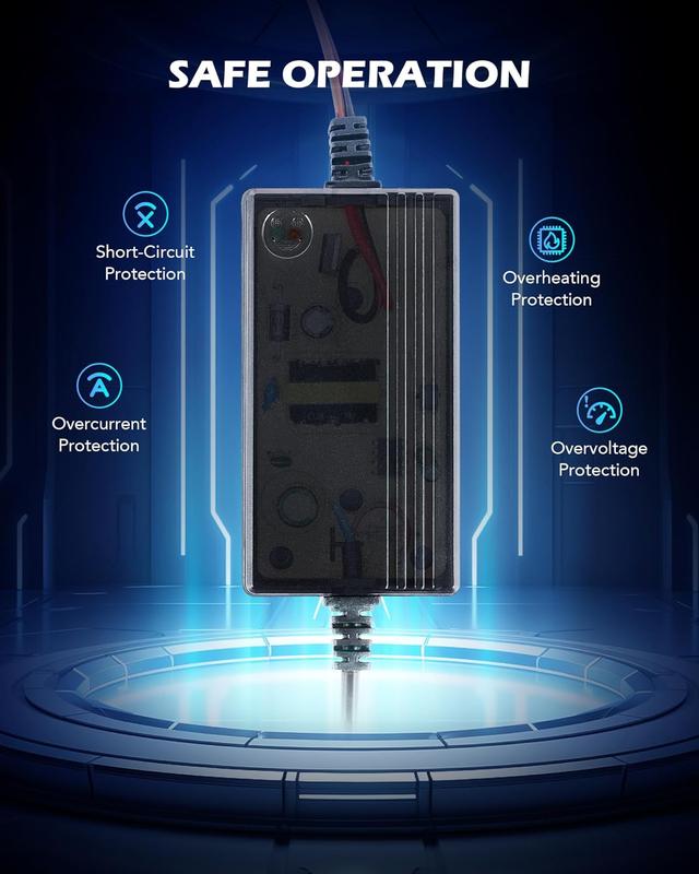 Fix the battery clamps and plug in the charger to enjoy efficient charging and safe maintenance; prevents short circuits, overcurrent, overheating, high-voltage spikes, and low-voltage dropouts for maximum safety
