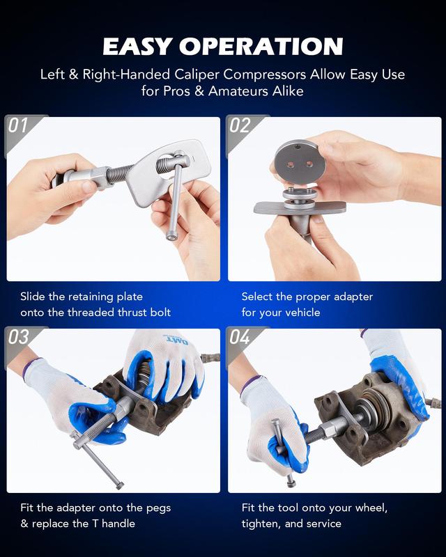 EASY OPERATION: Attach the plate to the handle, select the disc adapter that fits & rotate the pistons back into their calipers to clear your pads; embedded magnets in each thrust bolt assembly easily hold your drive keys & adapters in place during use