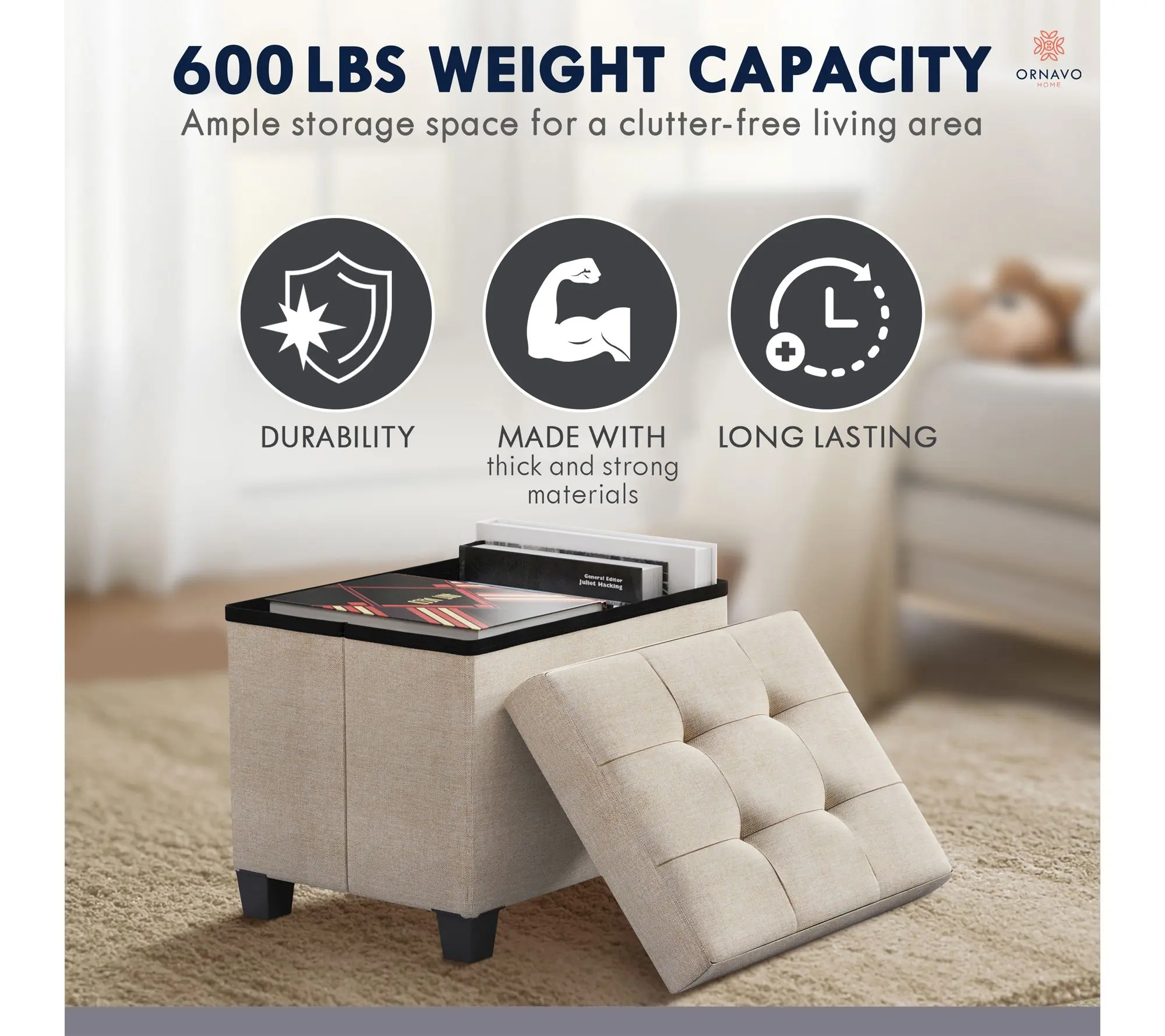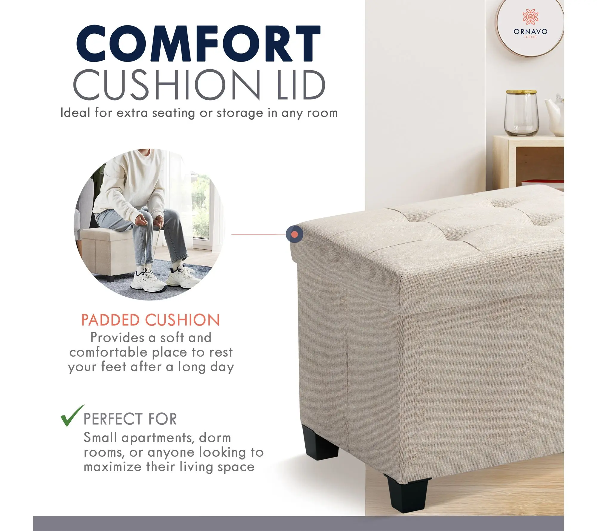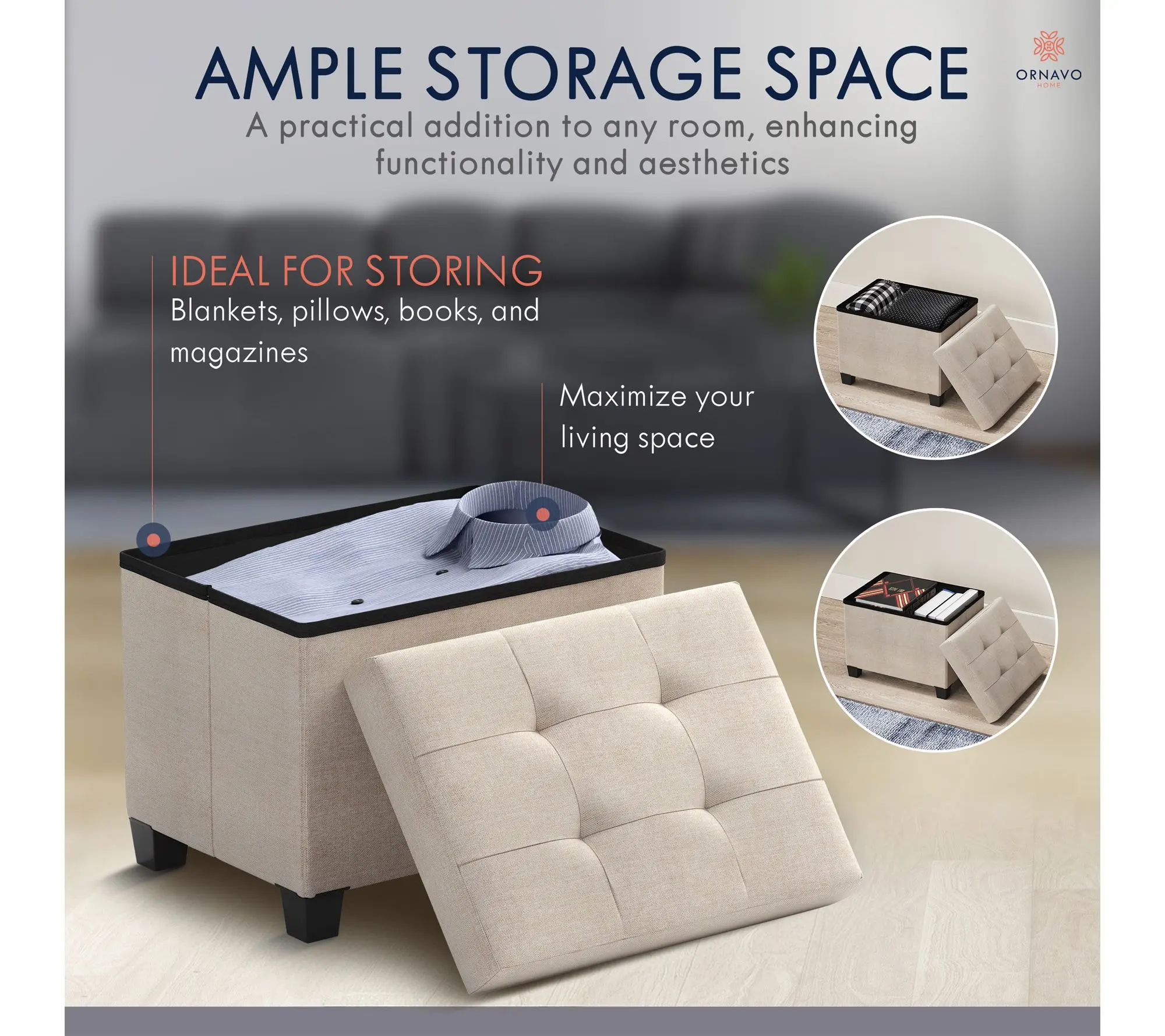 Tuck away blankets, books, or everyday essentials in this stylish storage ottoman, while adding a cozy extra seat to your living space. Whether placed at the foot of your bed, in your entryway, or beside your favorite reading chair, this versatile piece blends function and fashion for effortless home organization. From Ornavo Home.