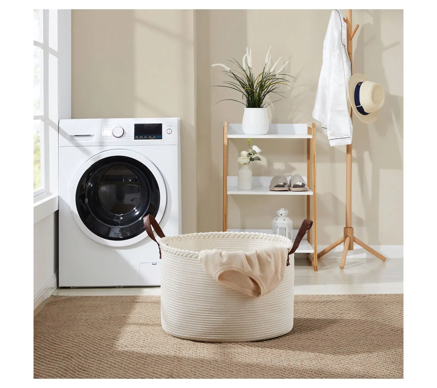 Ornavo Home XL Rope laundry storage basket with leather handles  #organization #organize #organizedhome #cozyathome #qvc