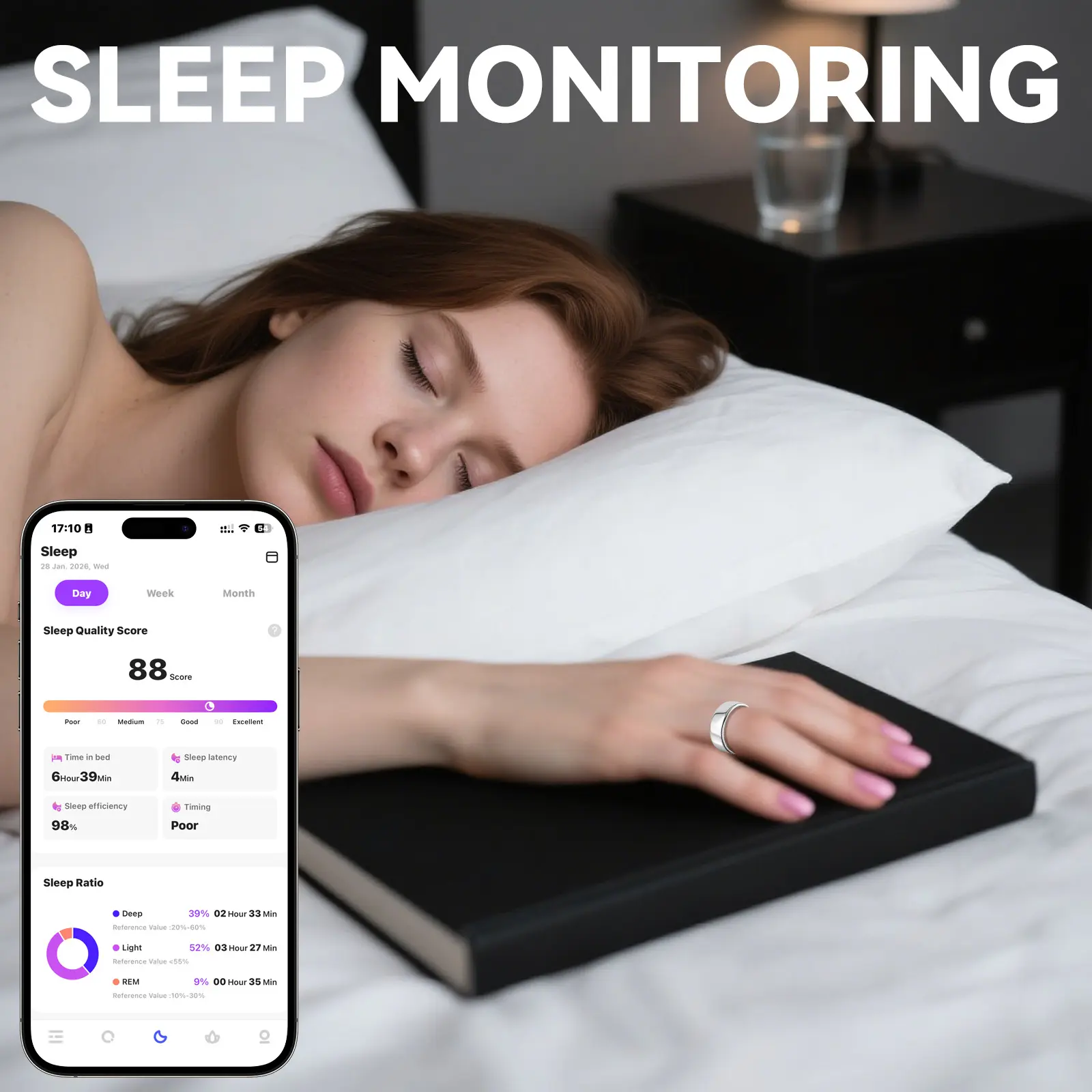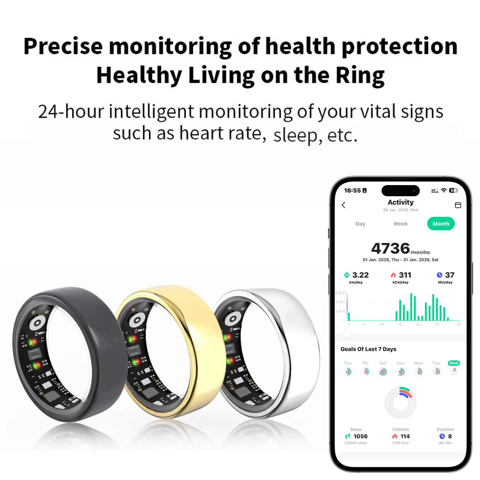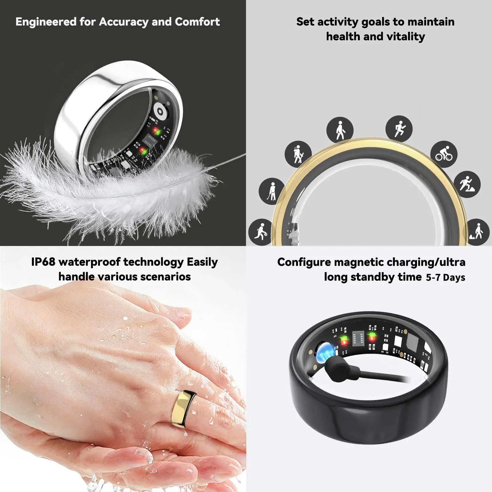 IP68 Waterproof & Remote Camera Control: Built with IP68 waterproof technology, this smart ring is perfect for swimming, showering, and other water activities. Plus, its innovative remote camera control feature lets you capture photos effortlessly by simply waving your hand—ideal for capturing life's special moments.