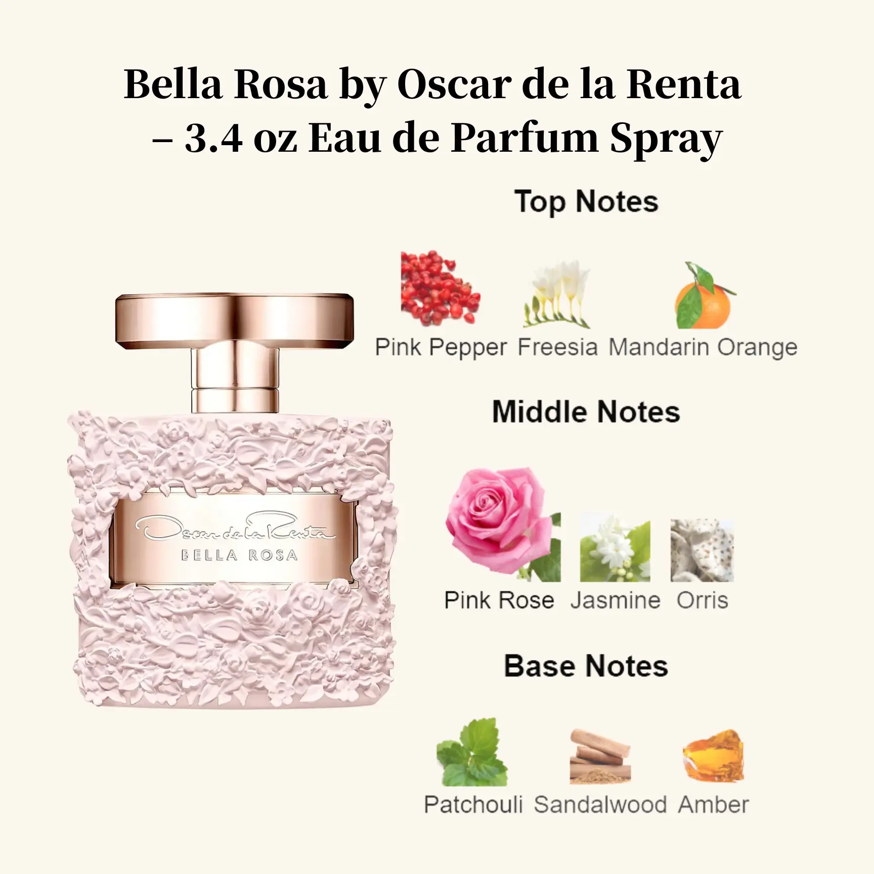 ·Bella Rosa by Oscar de la Renta – 3.4 oz Eau de Parfum SprayTop: Pink Pepper, Freesia, MandarinHeart: Jasmine, Lily, PeonyBase: Amber, Patchouli, SandalwoodBest for: Work, gatherings, refined florals, effortless sophistication
