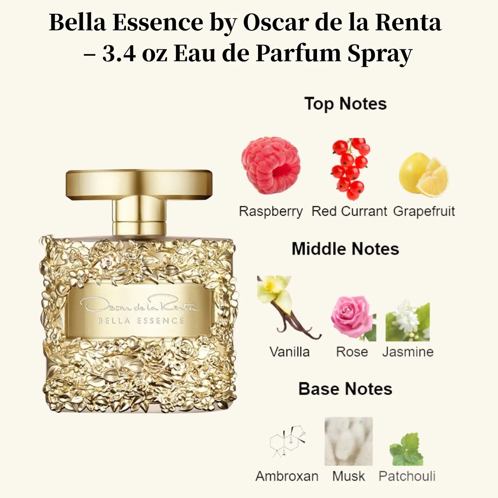 ·Bella Essence by Oscar de la Renta – 3.4 oz Eau de Parfum SprayTop: Raspberry, Red Currant, GrapefruitHeart: Rose, Jasmine, Vanilla OrchidBase: Musk, Amber, VanillaBest for: Daytime charm, sweet elegance, romantic outings