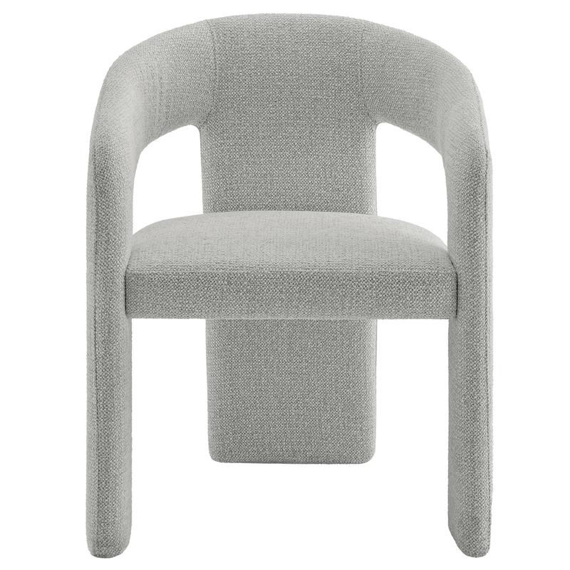 Embrace the perfect blend of modern style and versatile functionality with the Oslo Barrel Dining Chair. Featuring a striking design and unique three-leg frame, this open back chair makes a bold statement in any dining or living space. Fully upholstered in soft textured fabric with captivating depth, the Oslo Accent Chair is as inviting as it is stylish. The barrel-shaped curved back and padded seat offer ergonomic comfort, making it an ideal choice for long meals, work sessions, or relaxation. Better for you and the environment, the upholstery fabric is also OEKO-TEX® STANDARD 100 certified. Supported by a durable metal frame hidden beneath the luxurious fabric, this versatile upholstered chair is as sturdy as it is sleek. Equipped with non-marking floor glides and arriving fully assembled, the 3-leg chair effortlessly enhances any modern dining room, kitchen, or living space. Weight Capacity: 300 lbs.