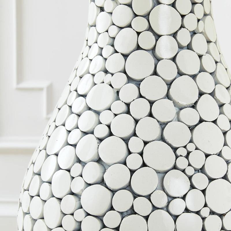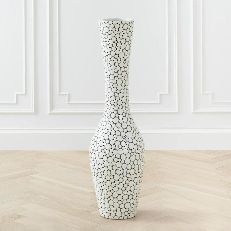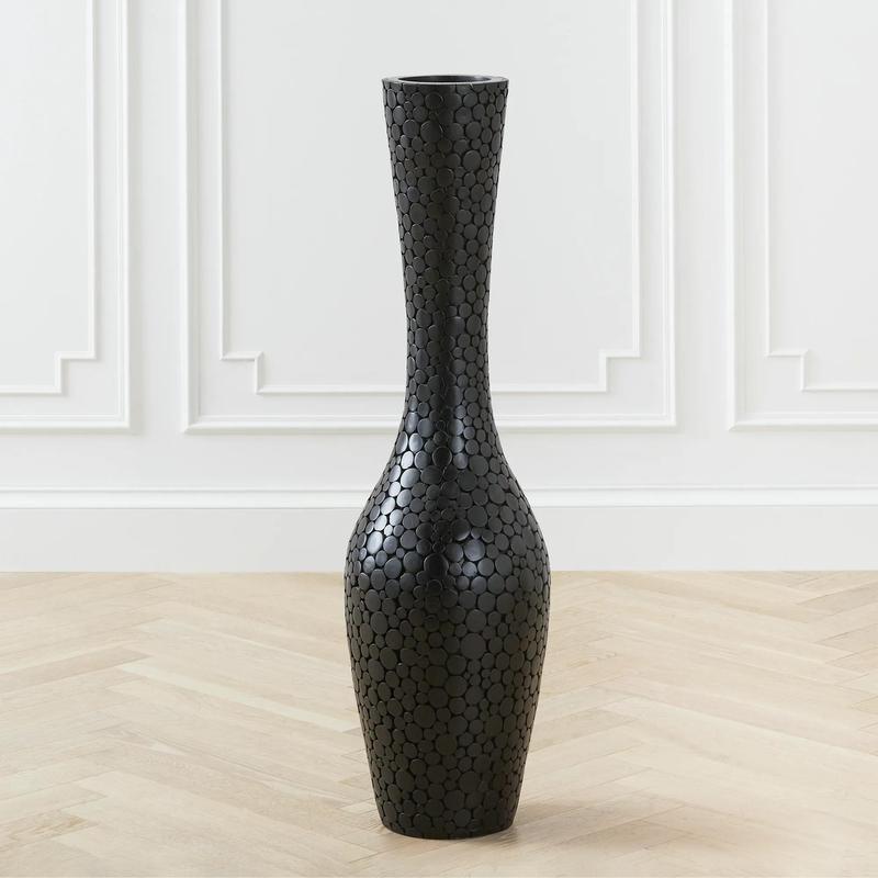 We’ve combined clean, contemporary design with the organic sensibility of natural materials to create our exclusive Black Oslo Vase. The simple shape of the large vase is crafted in a base of fiberglass, with a hand-applied overlay of intricately arranged flat coin-shaped pieces of wood. A smart glossy Black finish accents the modern appeal.