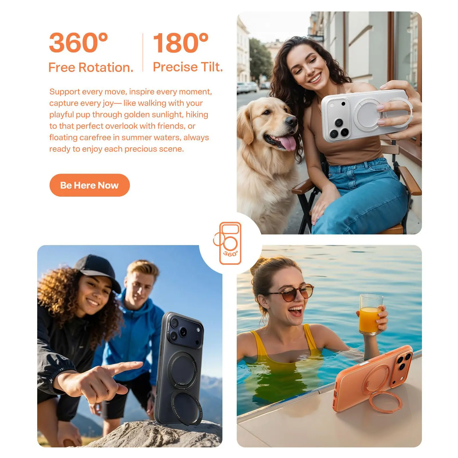 360 rotating runway-inspired kickstand case clicks into endless possibilities – snap vertically for sunrise yoga flows, rotate horizontally to capture DIY project tutorials, or tilt 45° for hands-free recipe scrolling. Camera Control Button ensures precise control and protection. The stand clicks into any angle with lab-tested precision, while the crisp click sound turns every rotation into a tiny victory and turns rotations into stress relief. Obsidian Black, Glacier White, Mint Green, and Coastal Blue match your unlimited creativity. Not just a case, but a creativity catalyst that empowers every moment to shine.