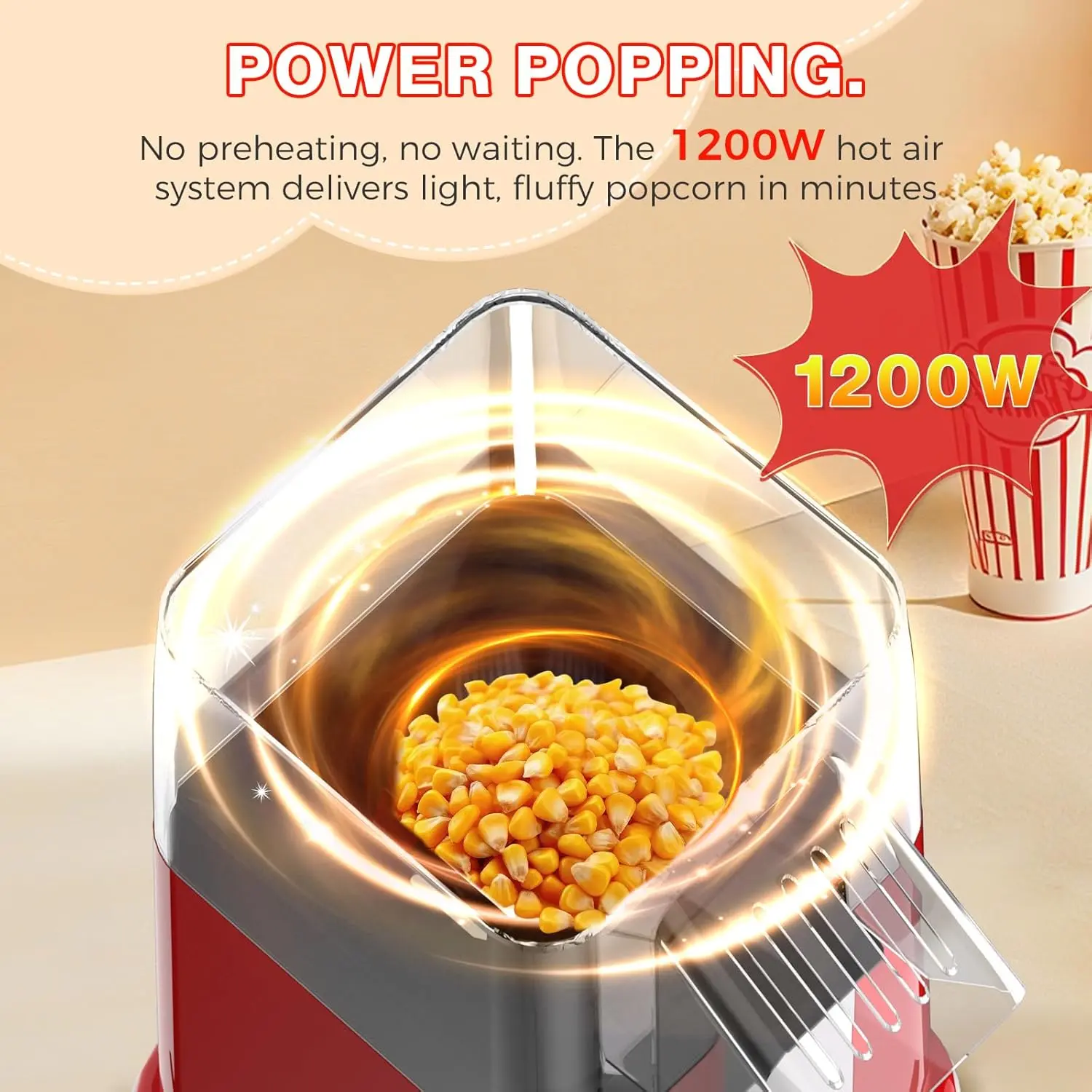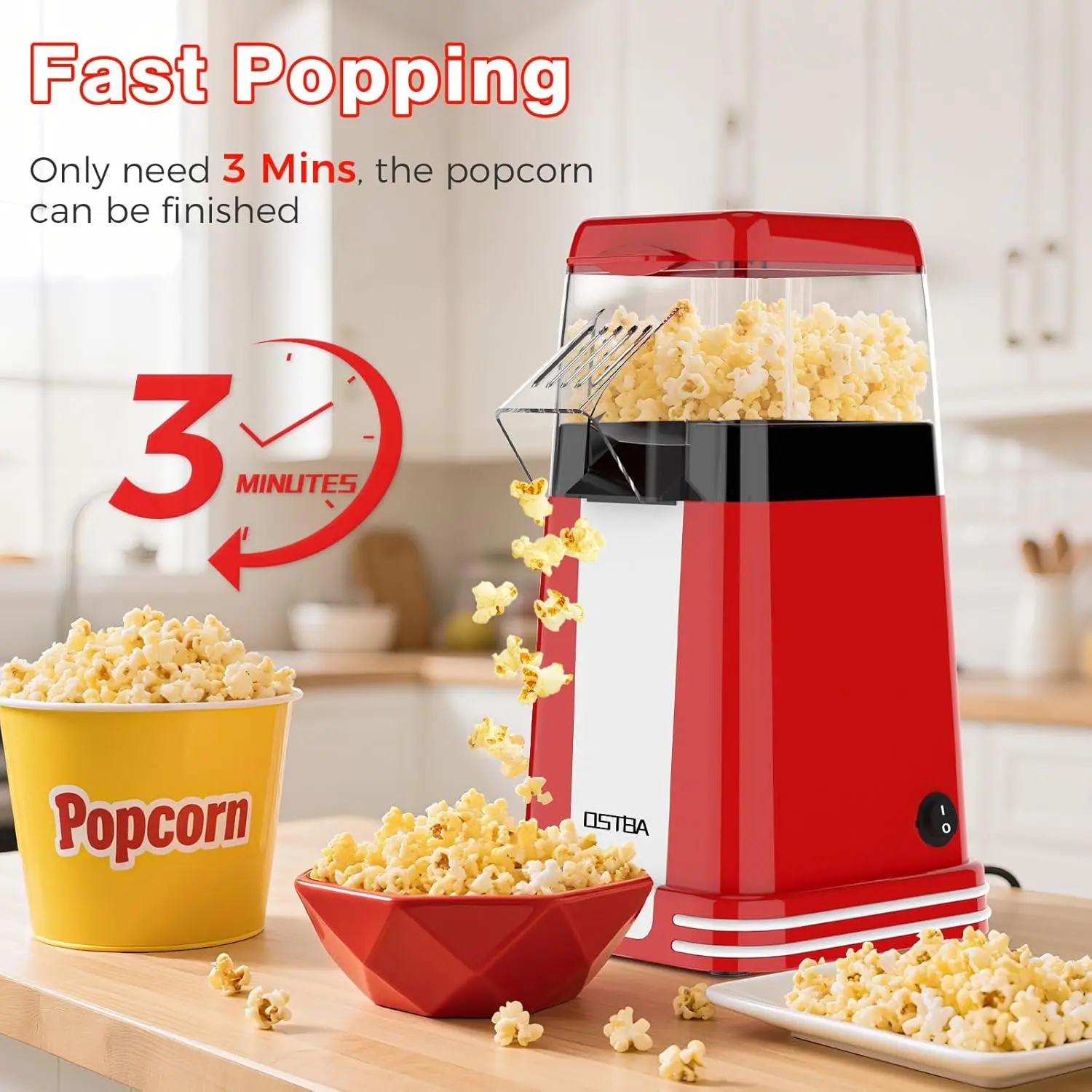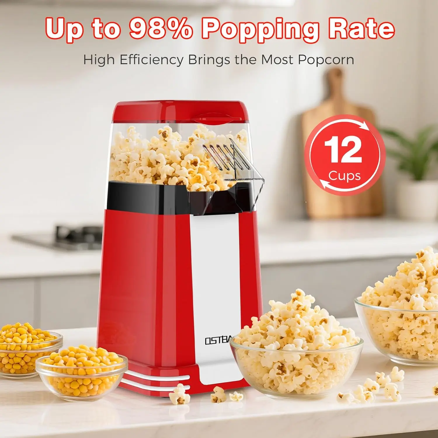 ·The OSTBA 1200W hot air popcorn popper makes up to 12 cups in 3 minutes. With a 98% popping rate, you get more fluffy popcorn and fewer unpopped kernels. Perfect for quick, efficient popcorn preparation.