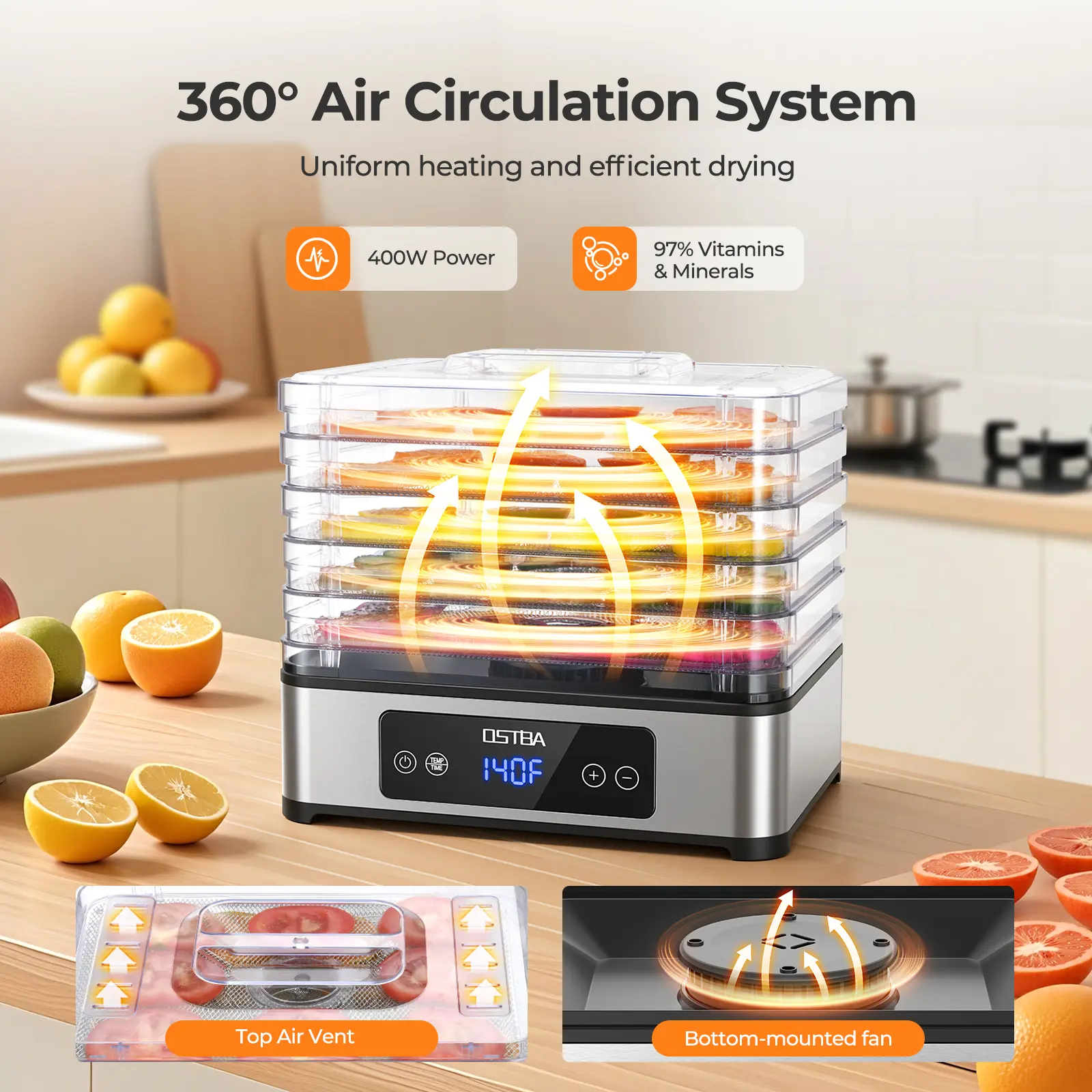 ·Even Drying with 360° Airflow:The 400W motor and 360° airflow ensure consistent heat distribution without tray rotation, making it a reliable jerky dehydrator, meat dehydrator, or mushroom dehydrator