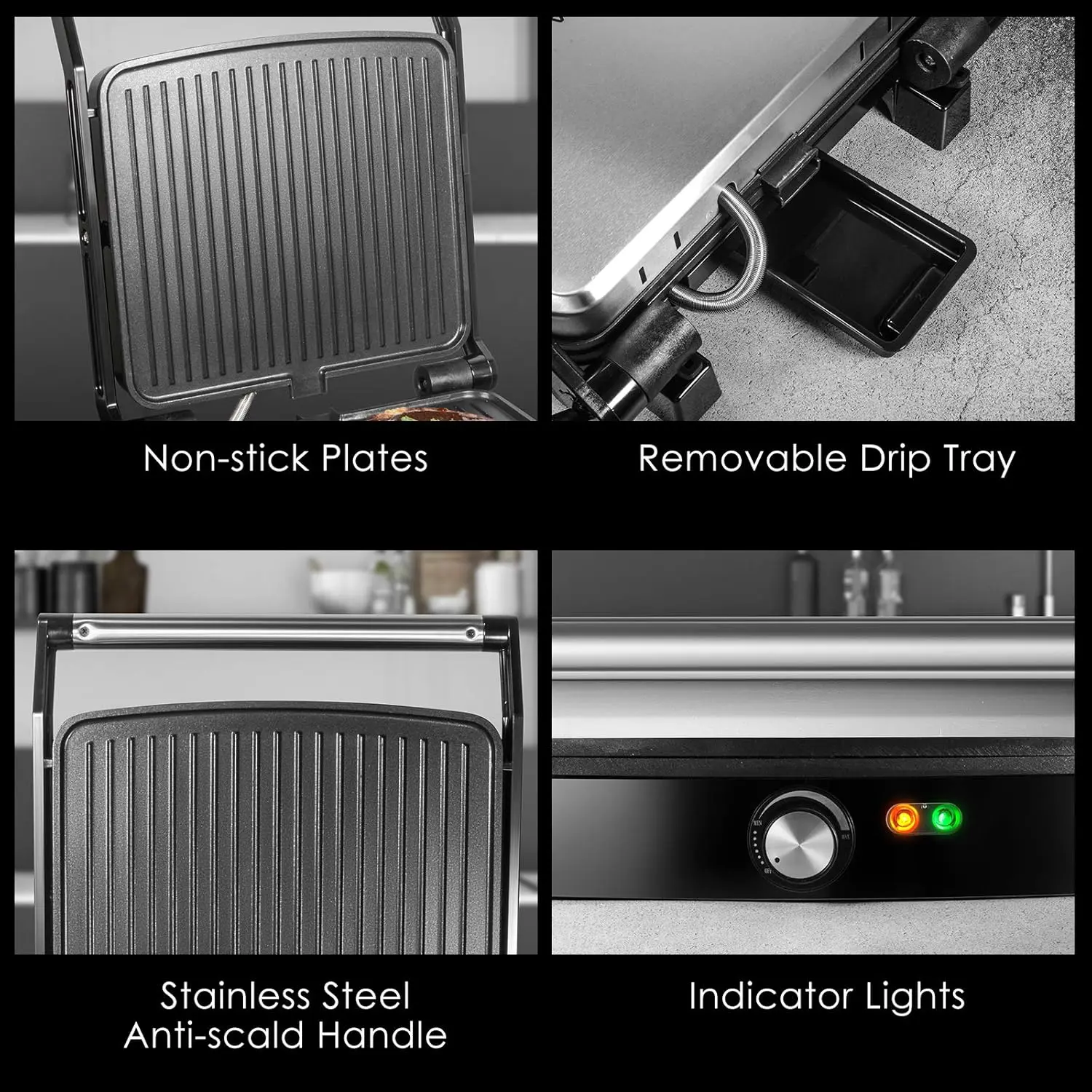 ·Non-stick surface ensures easy food release and cleanup. A removable drip tray collects excess grease, helping you cook healthier meals with less mess.