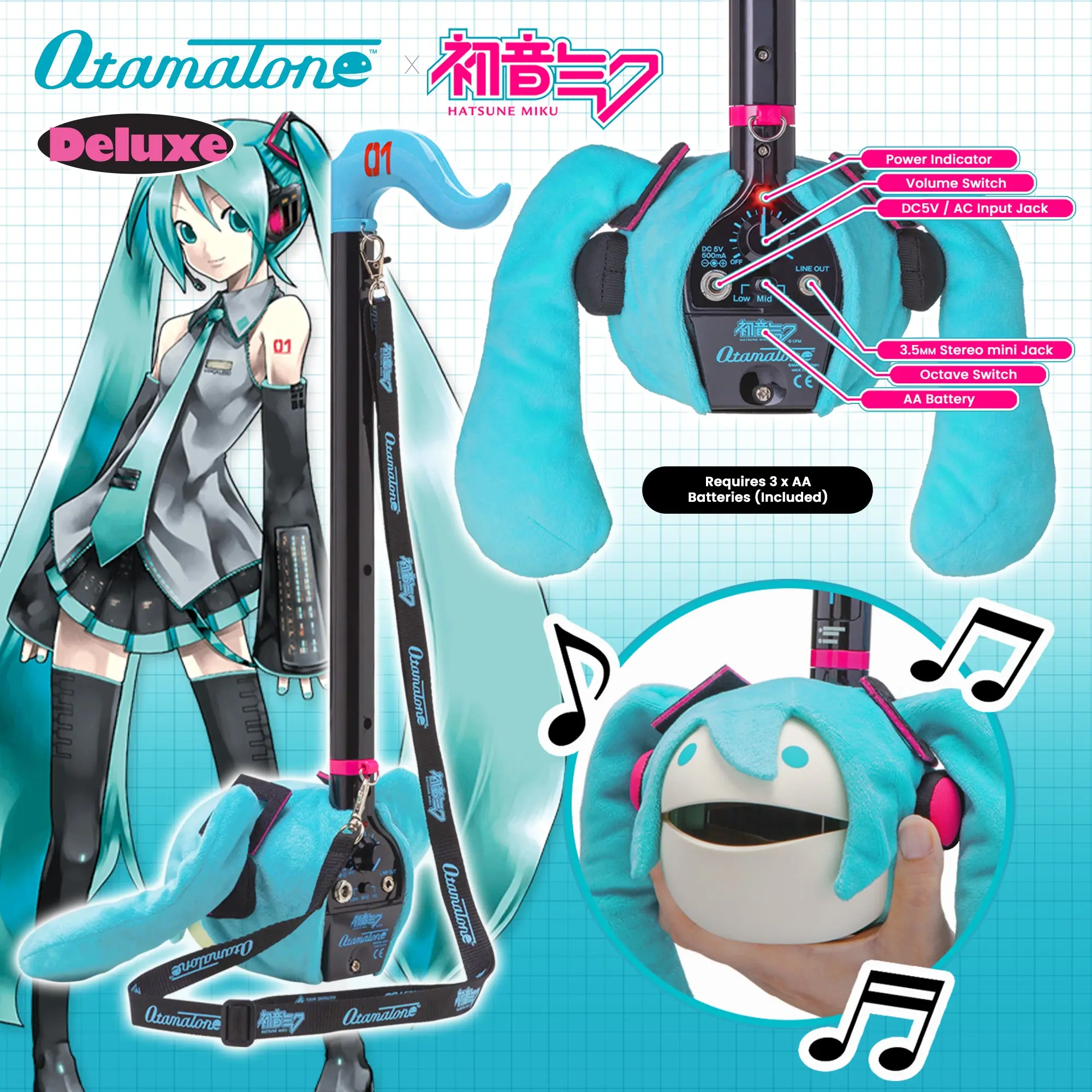·PACKAGE INCLUDES – 1 x Special Edition Hatsune Miku Otamatone Deluxe, 3 x AAA Batteries, 1 x Exclusive Otamatone x Hatsune Miku Strap, 1 x English Instruction Manual
