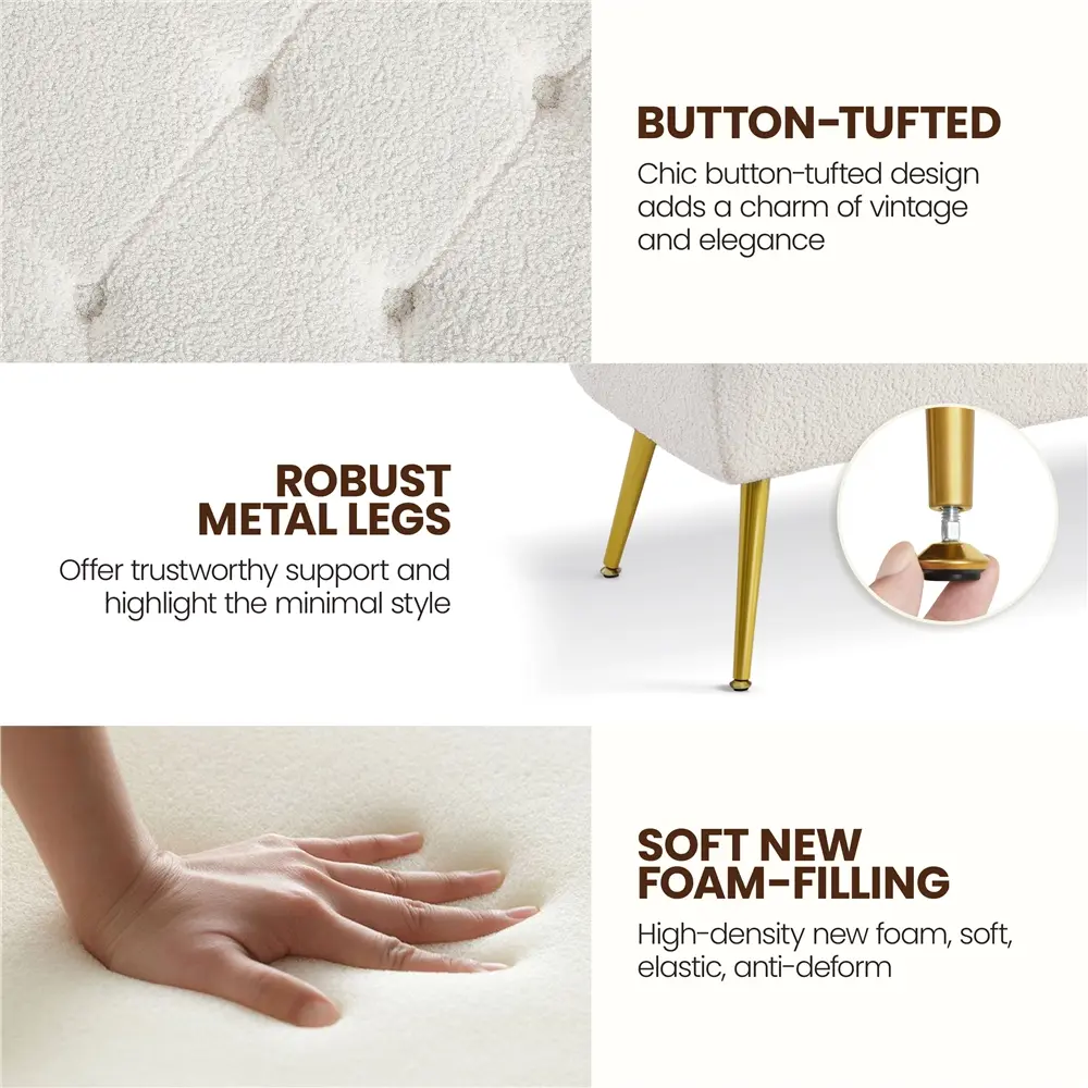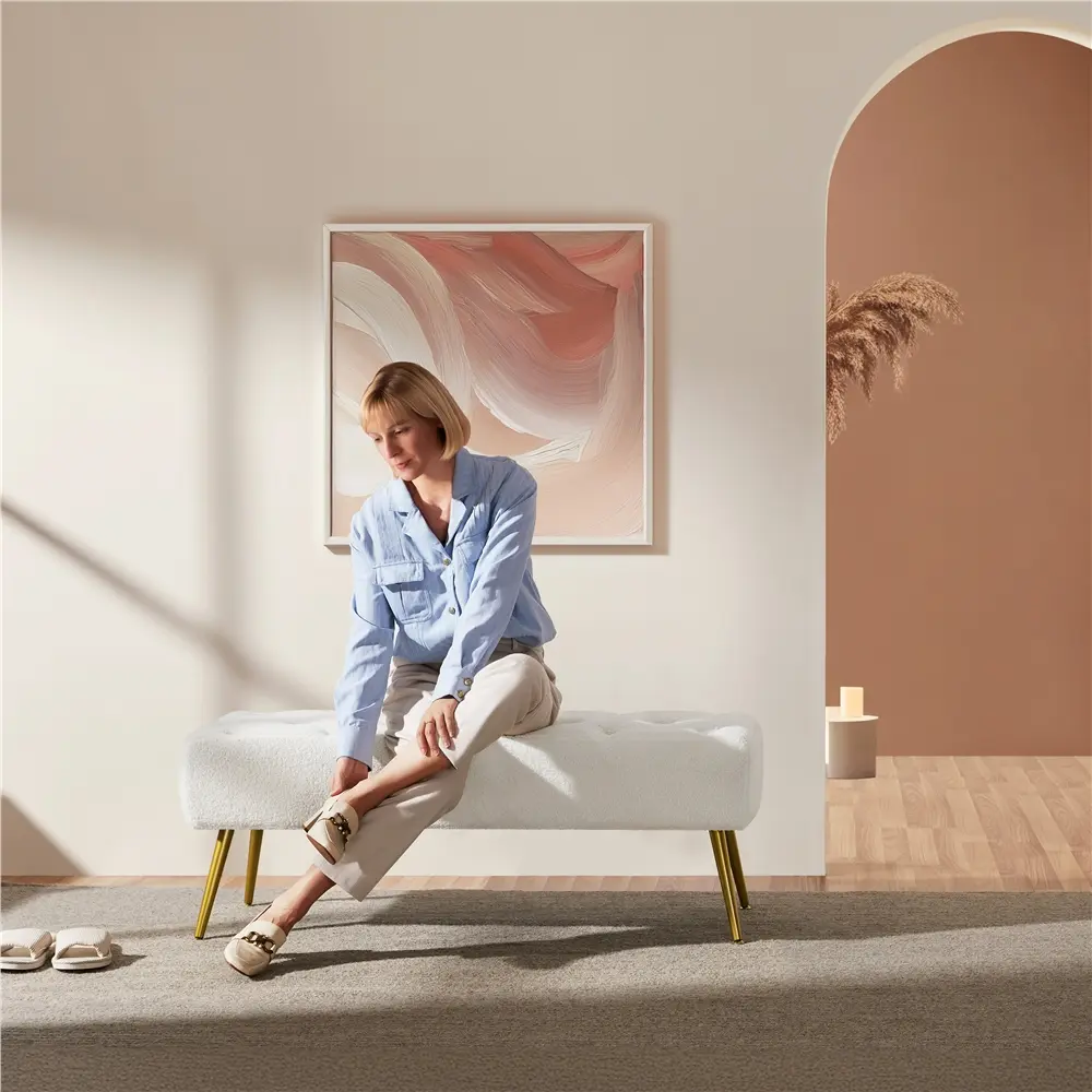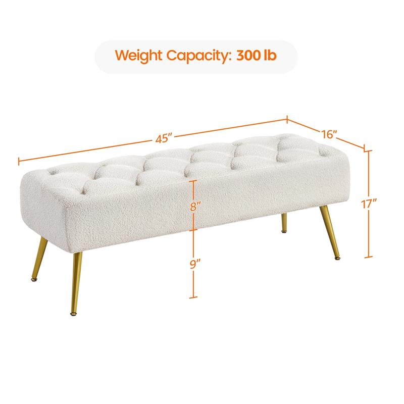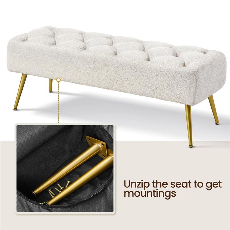 1. Soft Paded Bench: Padded with thick high-density foam and covered by soft velvet/polyester boucle (ivory), this tufted cushion seat features a soft, firm texture, making the seat bouncy and deformation-resistant. The breathable and skin-friendly fabric is long-wearing, capable of letting the air and heat go through