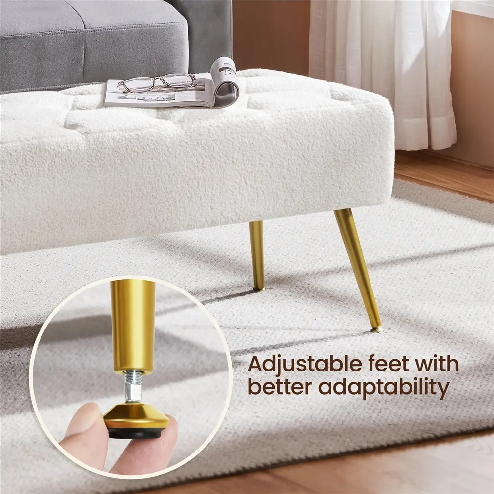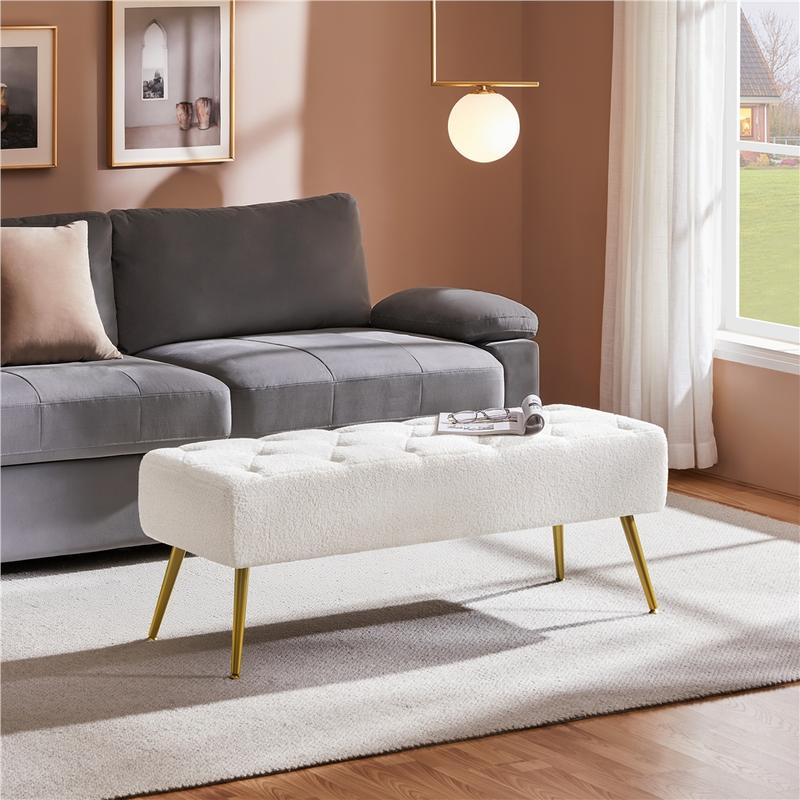 Crafted out of skin-friendly and resilient velvet/polyester bouclé (ivory), foam, plywood, and metal, this footstool bench has excellent weight capacity. The breathable and skin-friendly fabric is long-wearing and soft, and the high-density foam is elastic and firm to sit on. Four metal legs in a diagonal shape ensure you sit on it firmly.