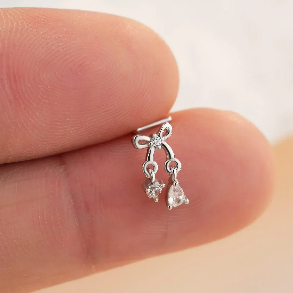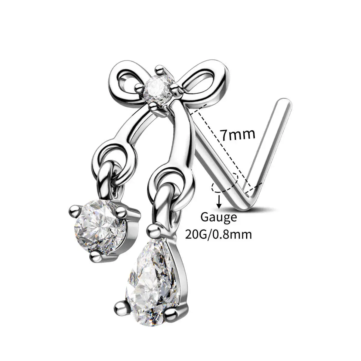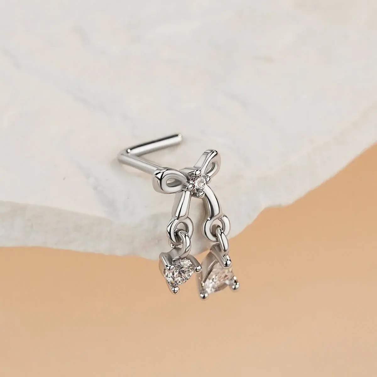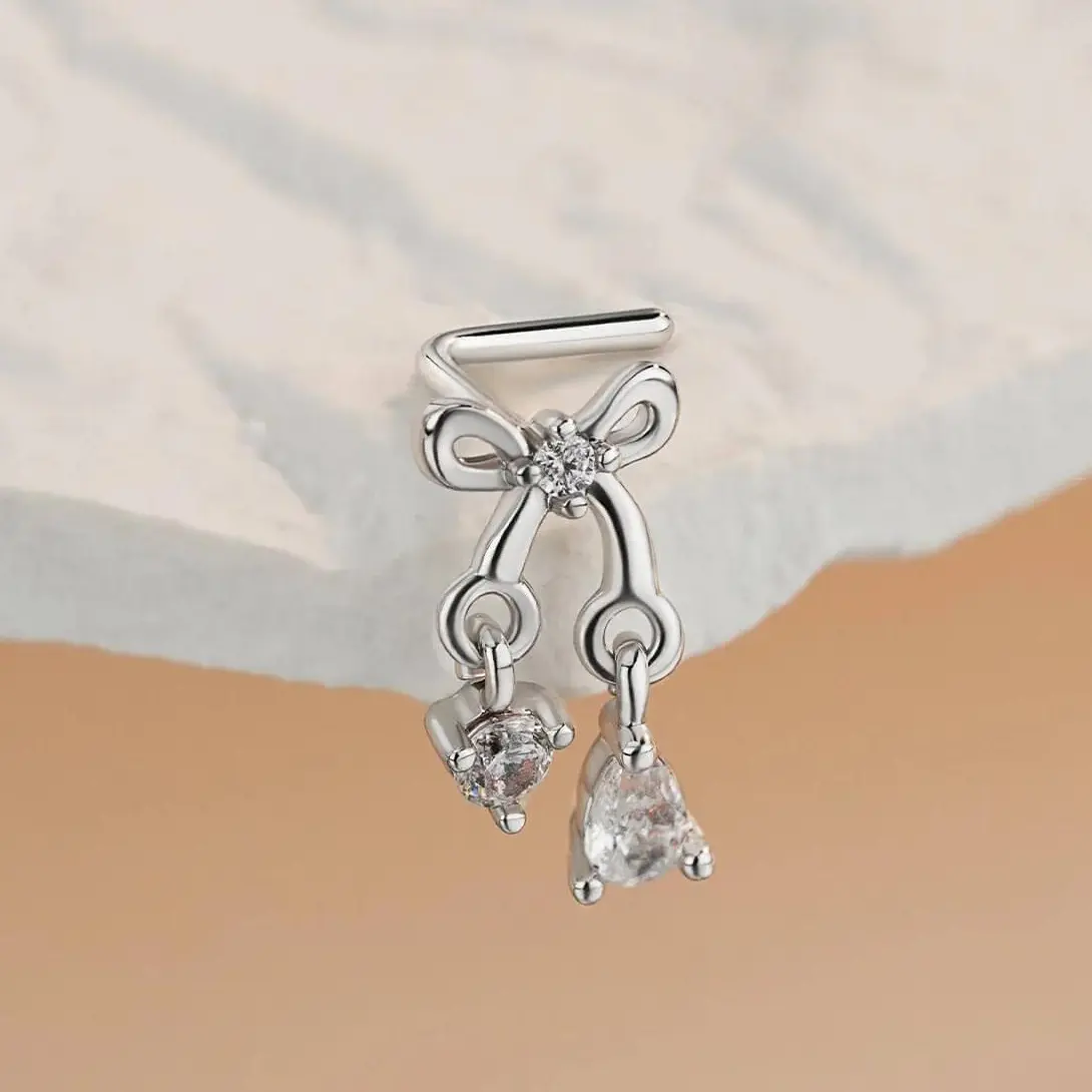 🌟 Oufer Clear CZ Dangel Bow L-Shaped Nose Stud 🌟