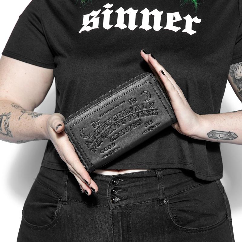 Faux leather zip around wallet with our Ouija design embossed on front. Gunmetal finish Blackcraft logo zipper and metal plaque. Features interior zip pocket as well as 12 credit card slots and custom interior lining.