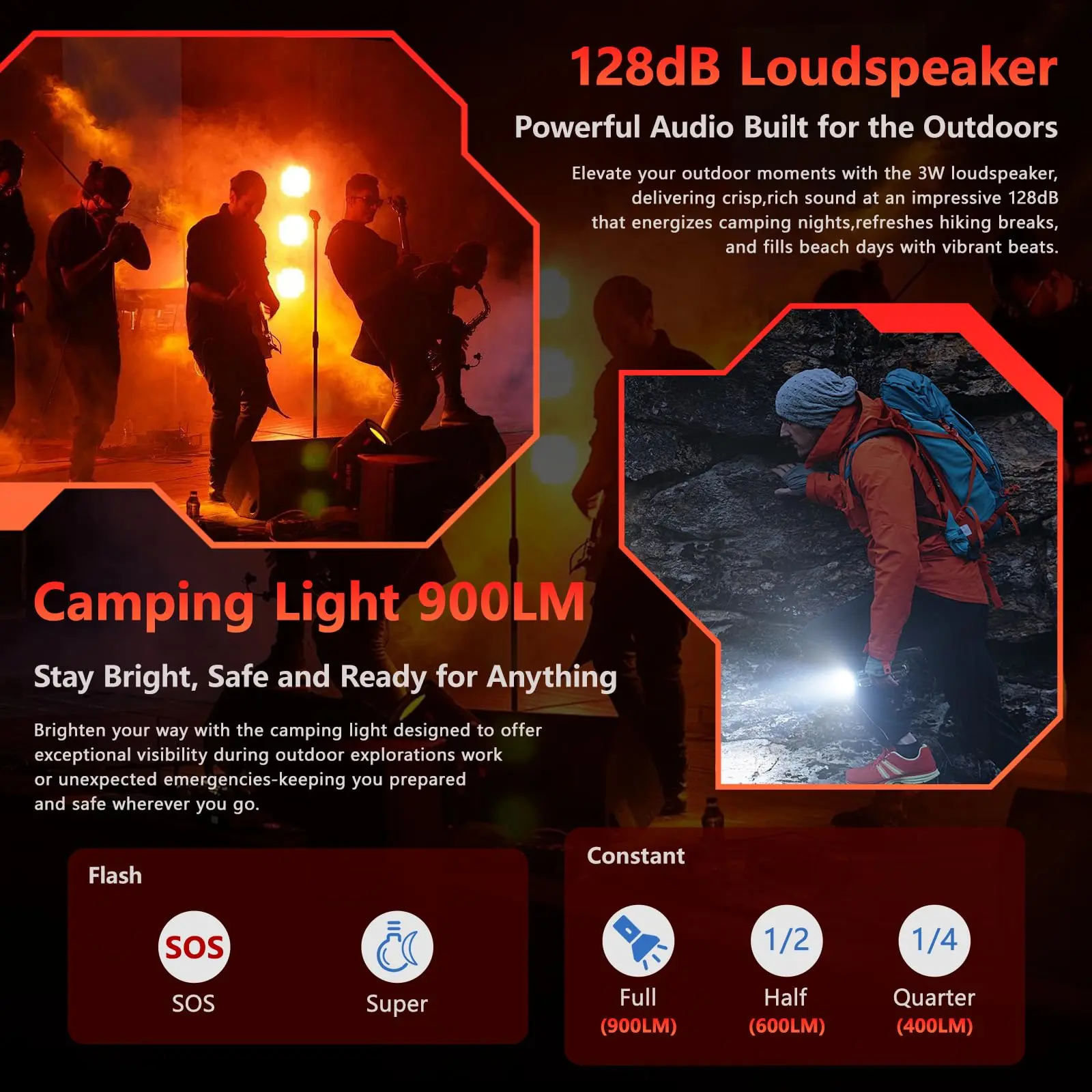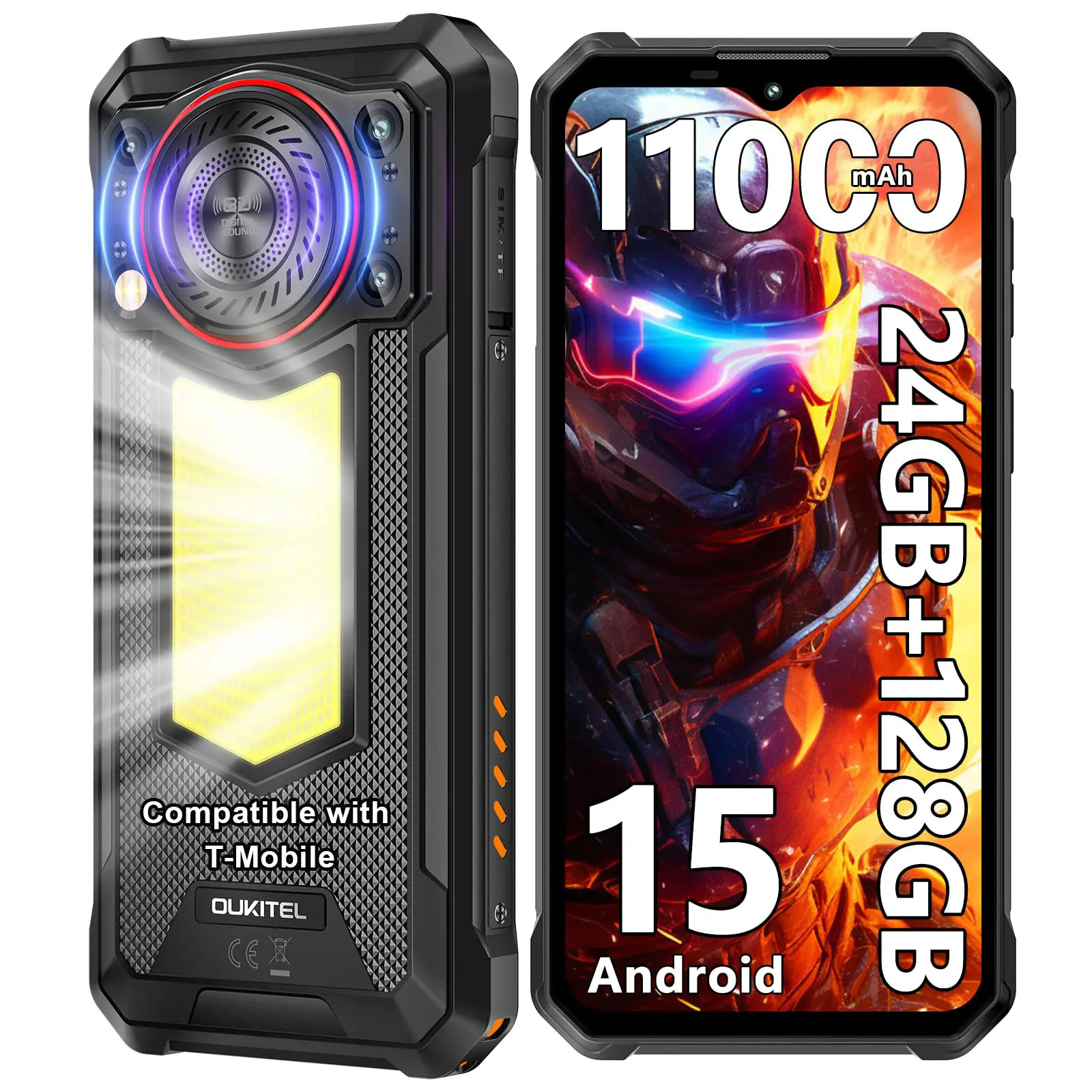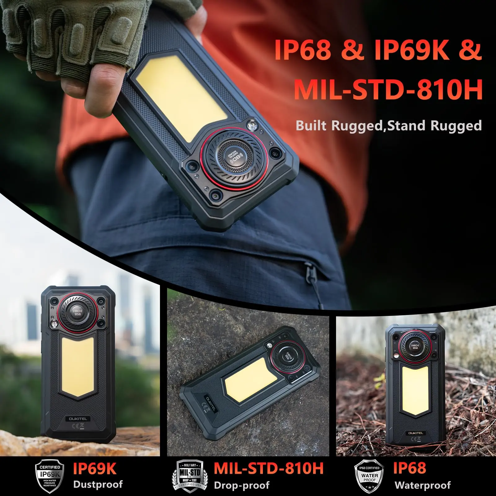 ·128dB Loud Speaker & 900LM Adjustable Camping Light: OUKITEL WP53 Cellphone massive 36mm high-amplitude speakers and powerful 3W output deliver crystal-clear, thunderous 128dB max stereo sound. Hear every detail perfectly, even on loud construction sites or bustling outdoor camps. Perfect for music, calls, or alerts – your audio commands attention anywhere. Master the outdoors with the WP53 smart phone. Its integrated 900LM ultra-bright camping light offers 3 adjustable brightness levels (Full:900LM / Half:600LM / Low:400LM) plus SOS & Strobe modes, ideal for camping, emergencies, or night tasks.