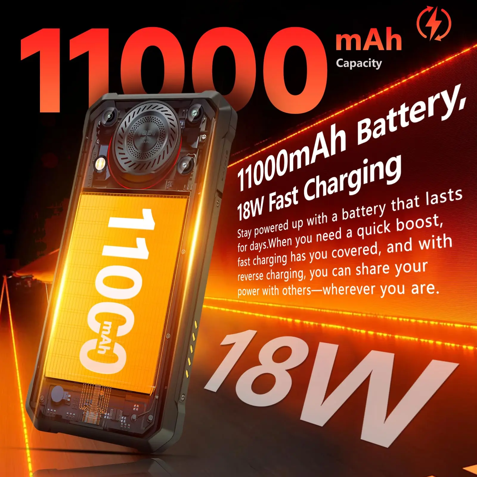 ·11000mAh Battery Cell Phone unlocked: Power through days on a single charge with the OUKITEL WP53 rugged phone massive 11000mAh battery. Say goodbye to battery anxiety during normal use. The included 18W fast charger gets you back up and running quickly. This rugged cellphone also supports OTG reverse charging, which can be used as a mobile power supply to charge other electronic devices. OUKITEL WP53 smartphone is perfect for outdoor adventures and long work.