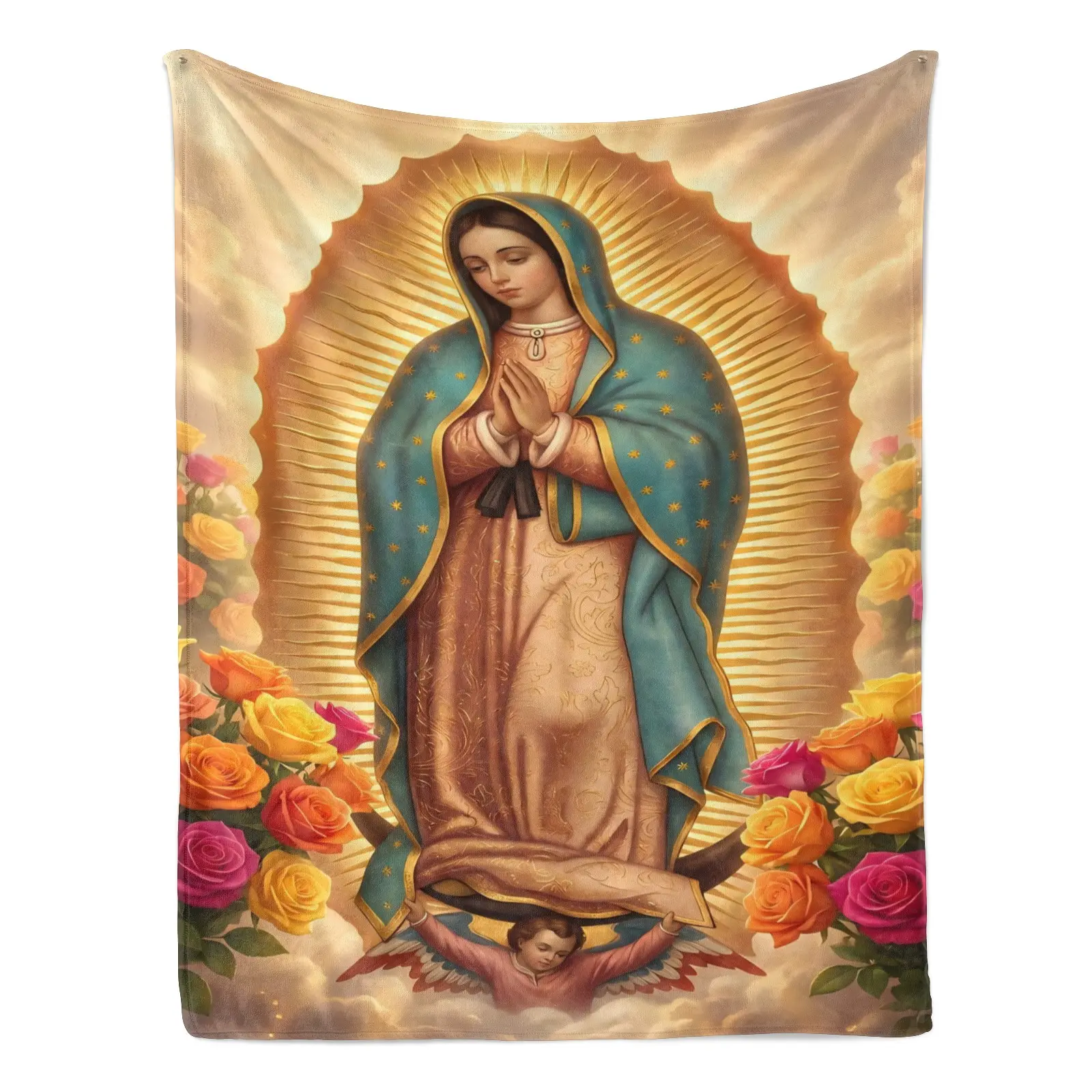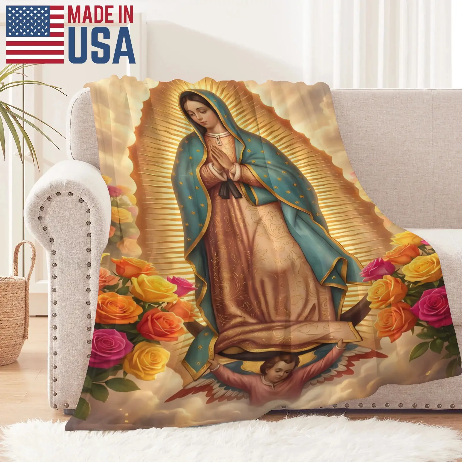 5. Our Lady of Guadalupe with Rainbow Roses Flannel Blanket Soft Cozy Plush Throw Perfect Religious Gift for Catholics Devotees Warm Snuggle Blanket for Bedroom Prayer Space Iconic Sacred Art Design