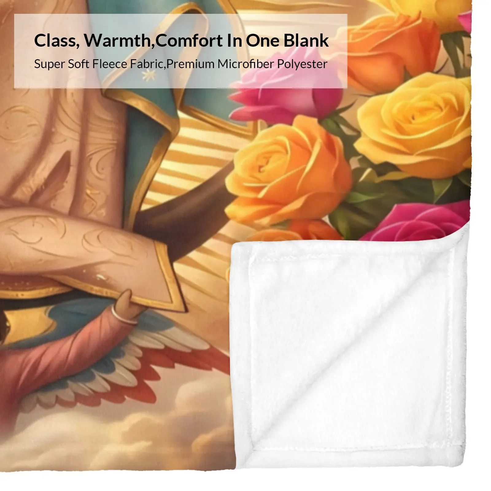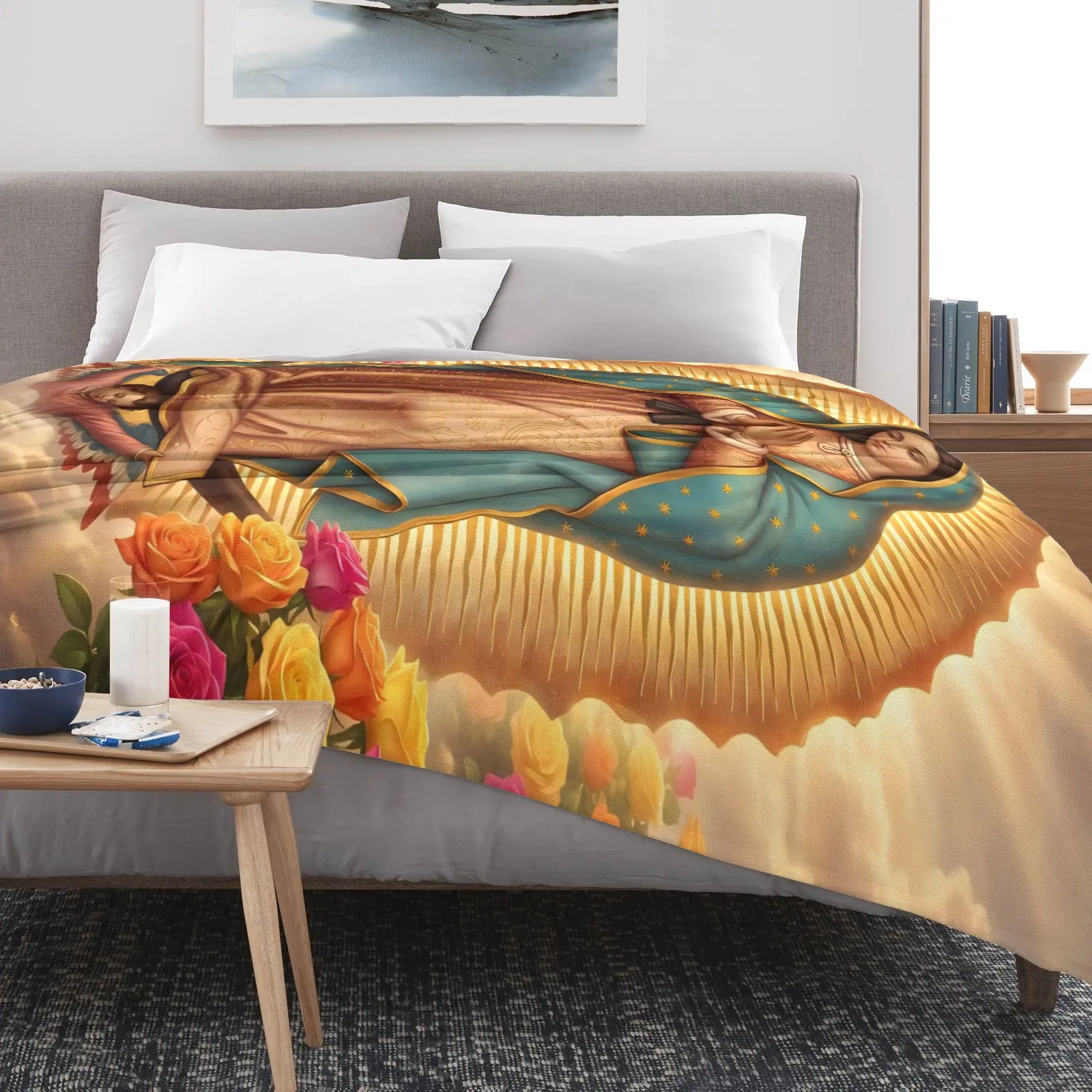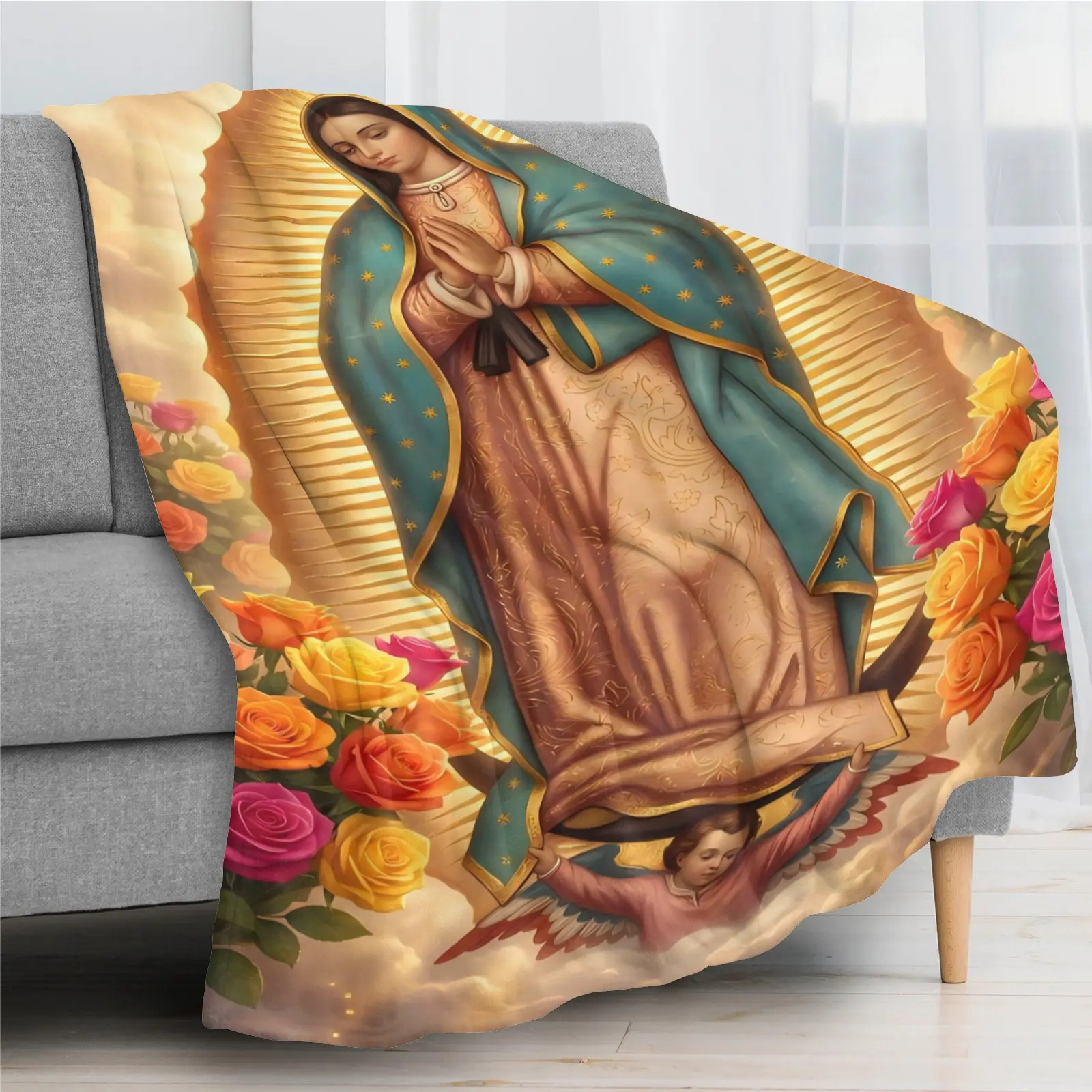 Our Lady of Guadalupe with Rainbow Roses Flannel Blanket Soft Cozy Plush Throw Perfect Religious Gift for Catholics Devotees Warm Snuggle Blanket for Bedroom Prayer Space Iconic Sacred Art Design