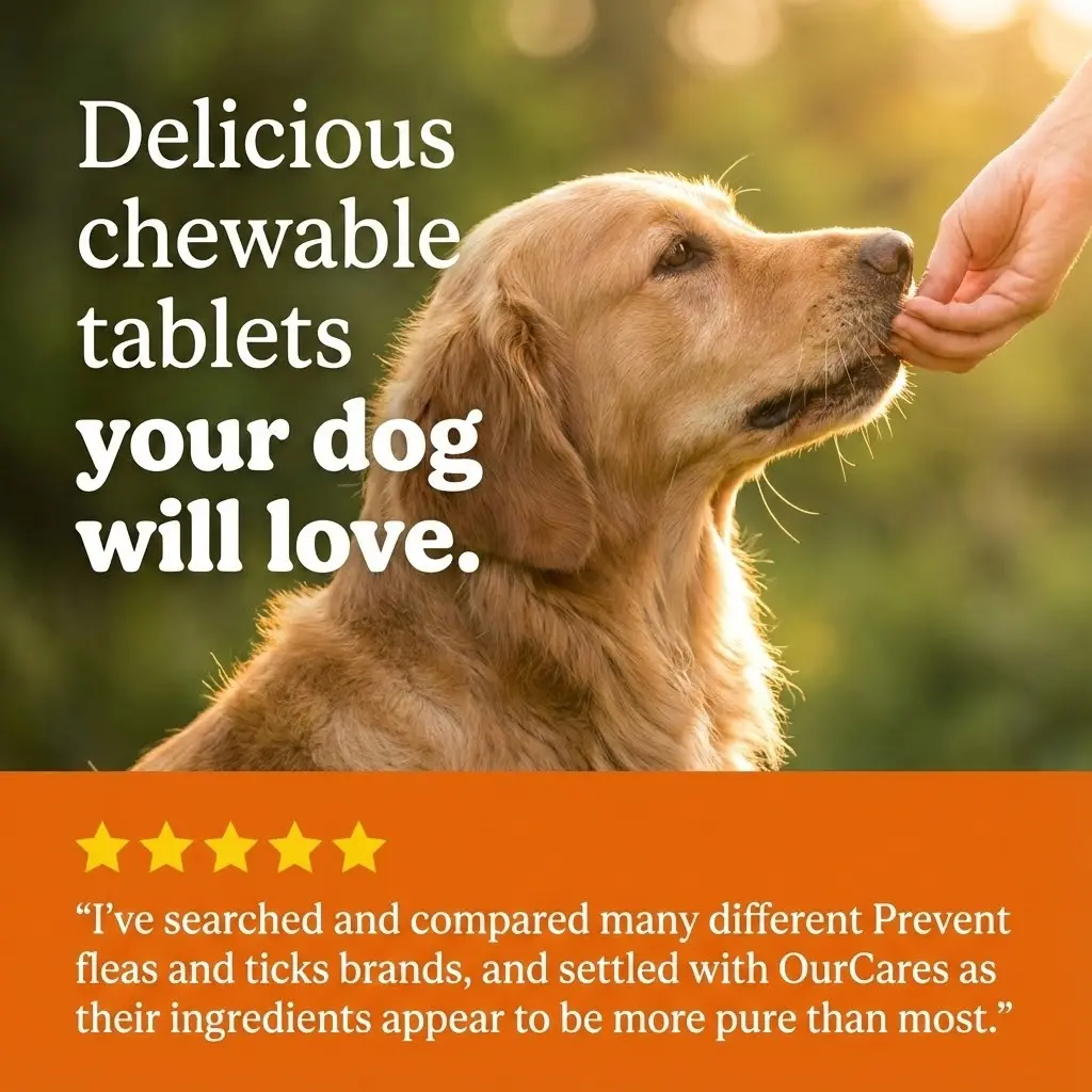 ·OurCares Flea & Tick Prevention comes in a natural chicken flavor. Your pet enjoys the taste while benefiting from protection. This makes it an appealing supplement for your dog.