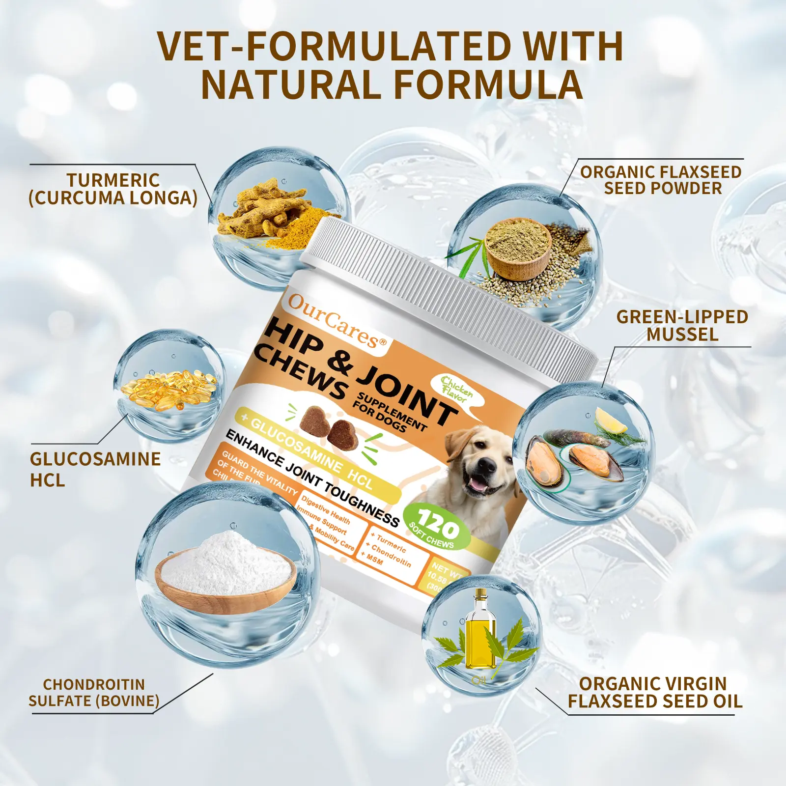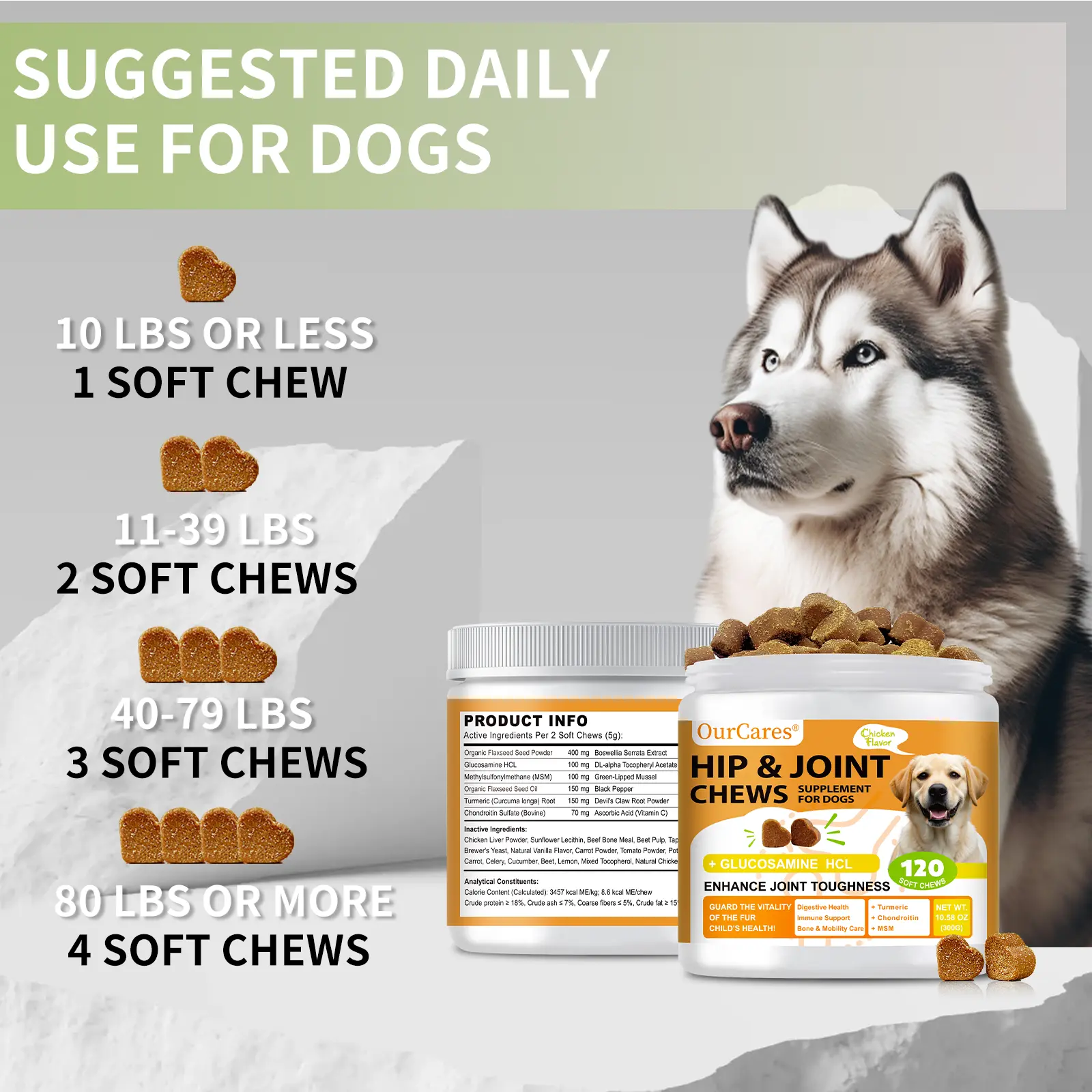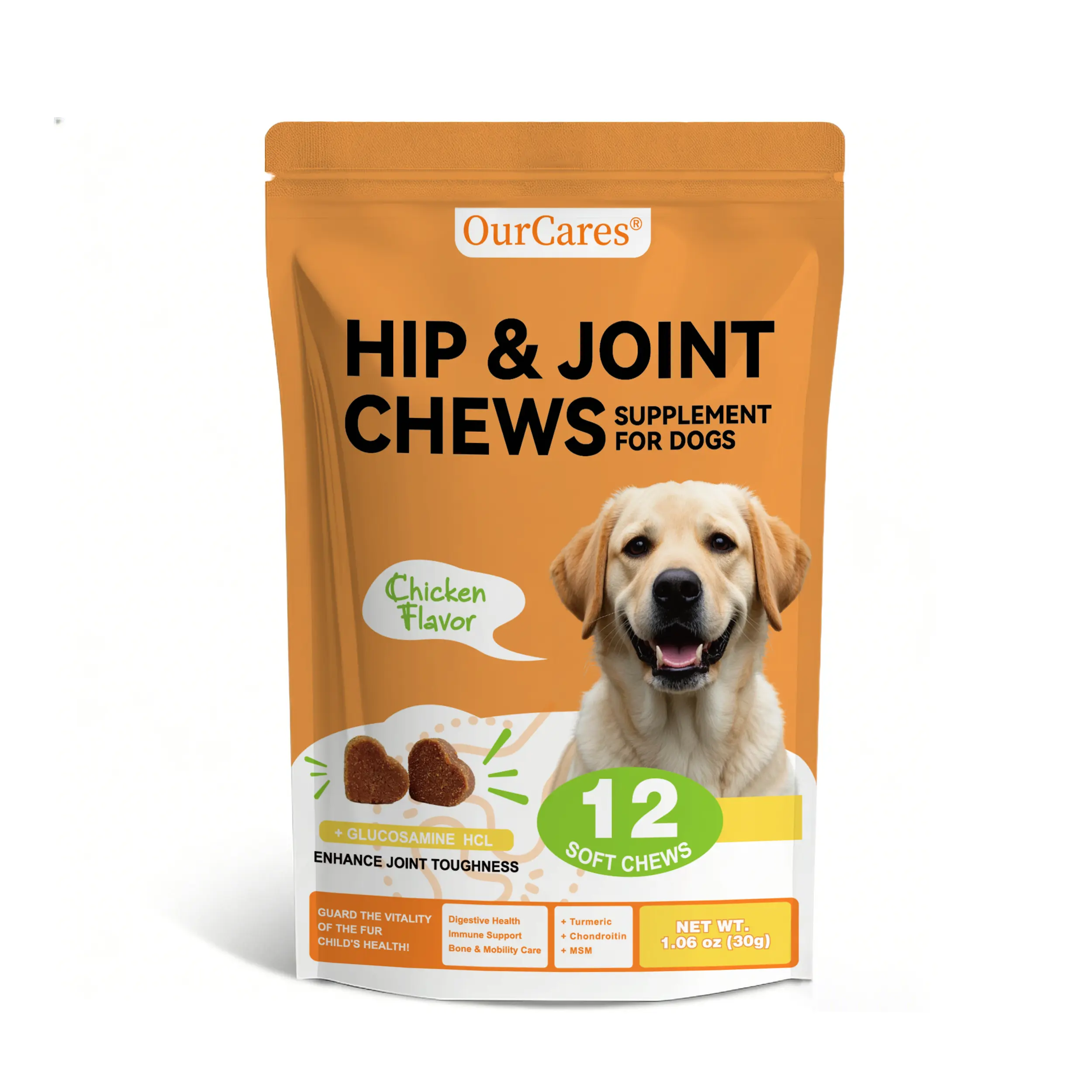 OurCares Hip and Joint supplement is designed for dogs. It includes glucosamine, chondroitin, MSM, vitamins C & E, and chicken flavor. Perfect for daily chews, these 120 soft chews are a convenient pet snack. 🍗