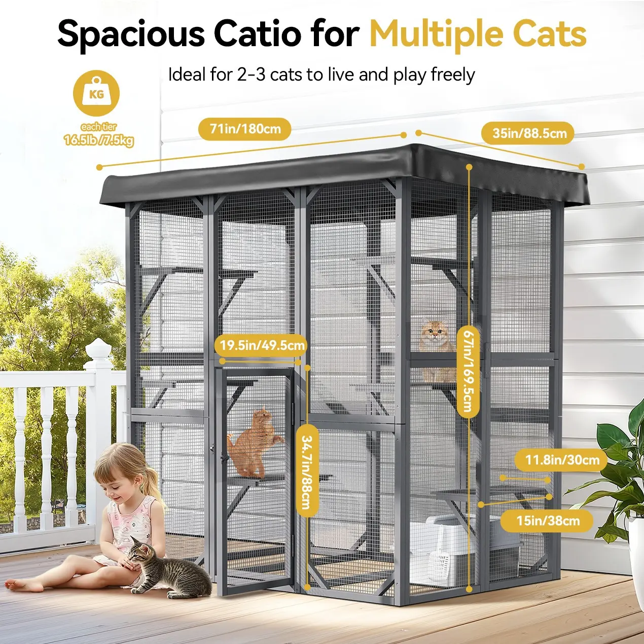 The cat enclosure measures 71" * 35" * 67". This size ensures ample space for your cats to move around and rest comfortably.