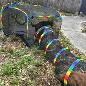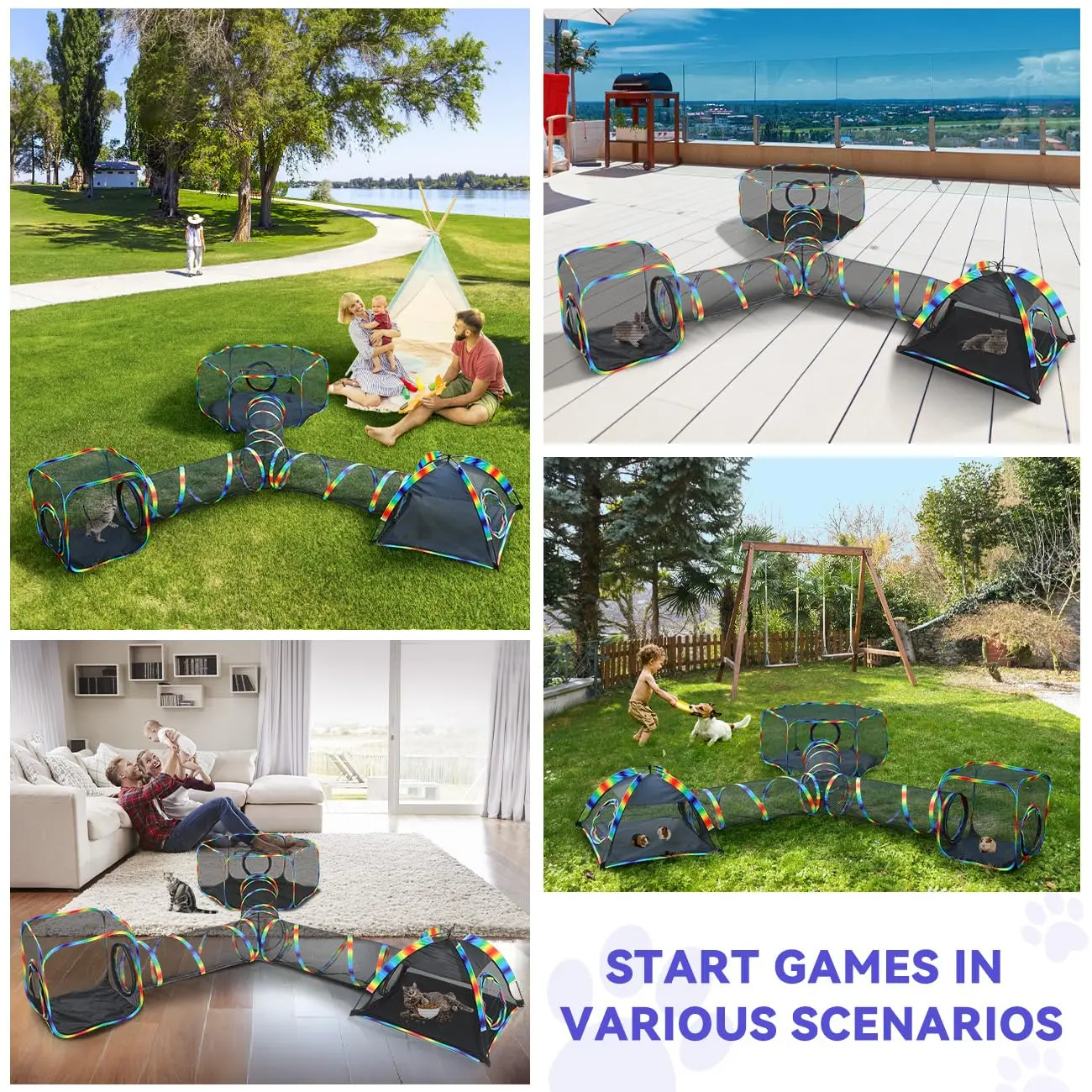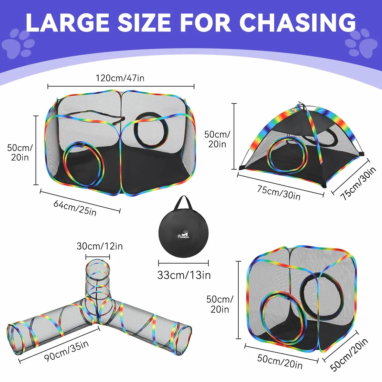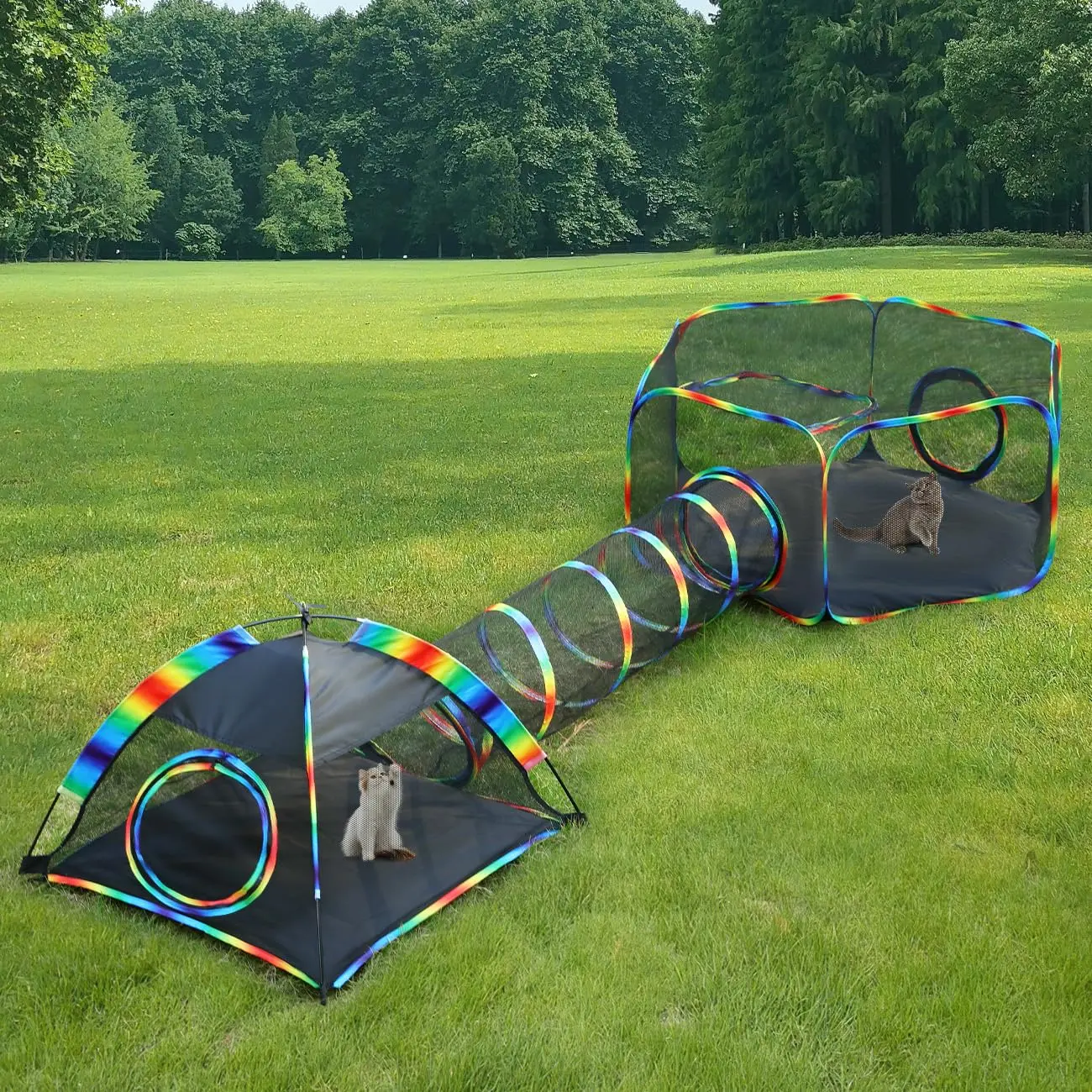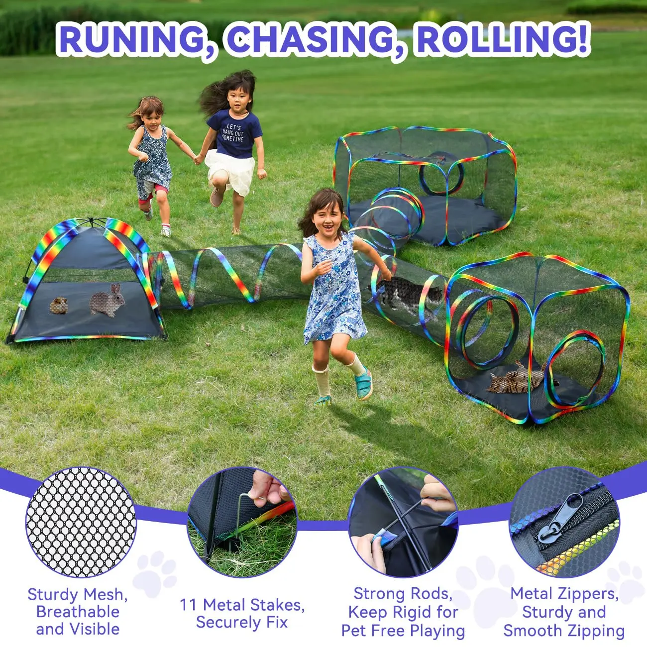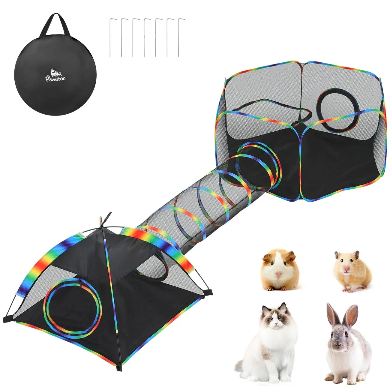 Pawaboo Outdoor Cat Enclosures for Cats Indoor, Patio Portable Mesh Cat Tent, Tunnel, Playhouse with Free Carry Bag & Metal Rod for Multiple Small Animals, Includes Cat Playpen+2 Tent+ Tunnel,Rainbow