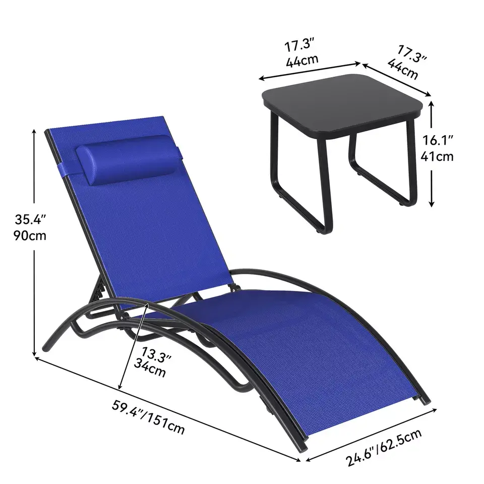 Package Includes: The chaise lounge set includes 2 lounge chairs and a side table; Suitable for various outdoor places, such as poolside, garden, patio, beach, or deck; Comes with easy-to-follow instructions for quick and easy assembly
