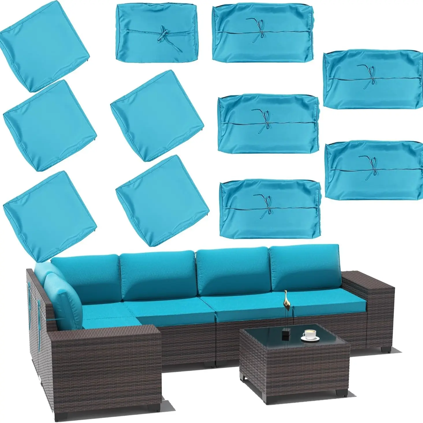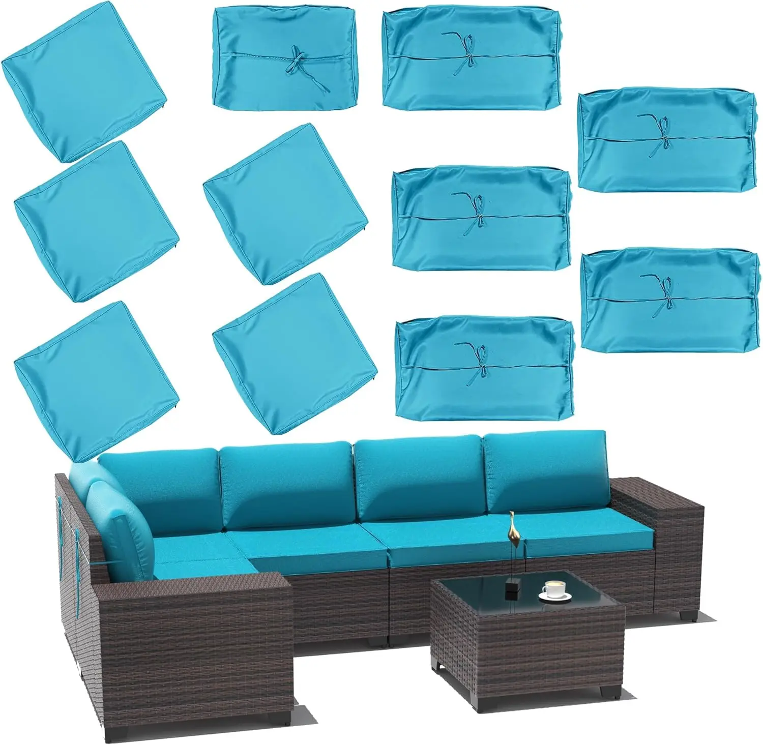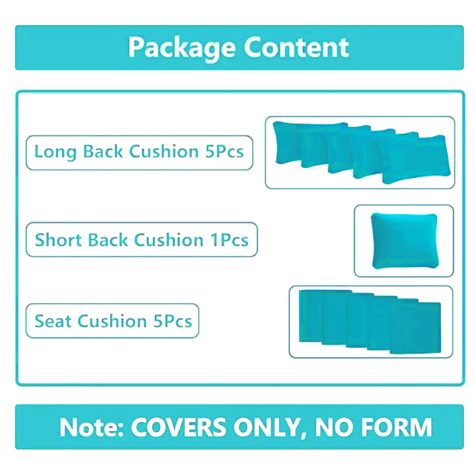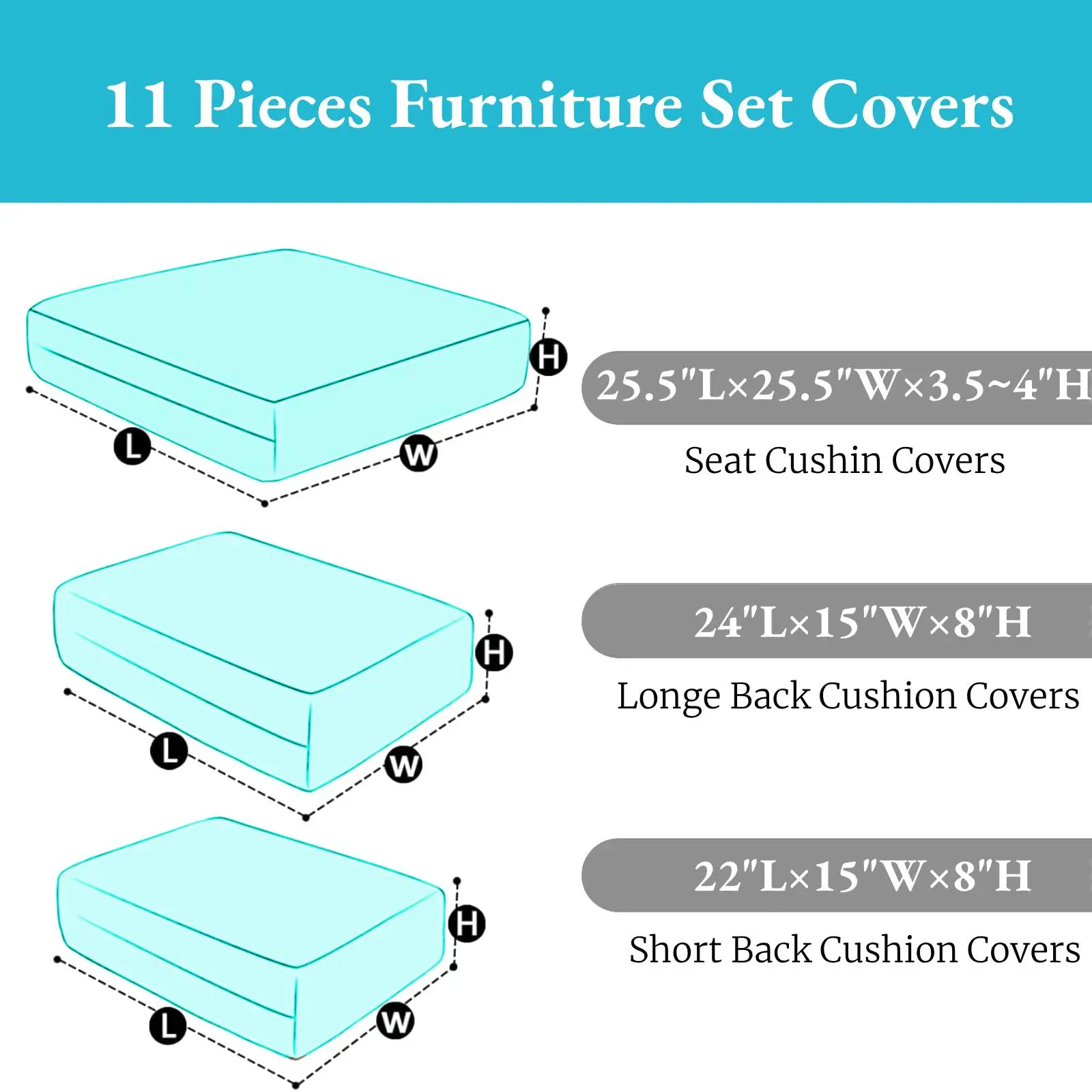 Cushion Cover SIZE: 5 Seat cushion covers (25” x 25” x 3.5-4” ), 5 extended backrest pillow covers (24” x 15” x 8” ), 1 short backrest pillow cover (22” x 15” x 8” ), outdoor cushion cover allows you to perfectly solve the contaminated cushion, continue to enjoy the patio life. Make your entire porch set look brand new! Highly recommend these to anyone who wants to restore their outdoor furniture.